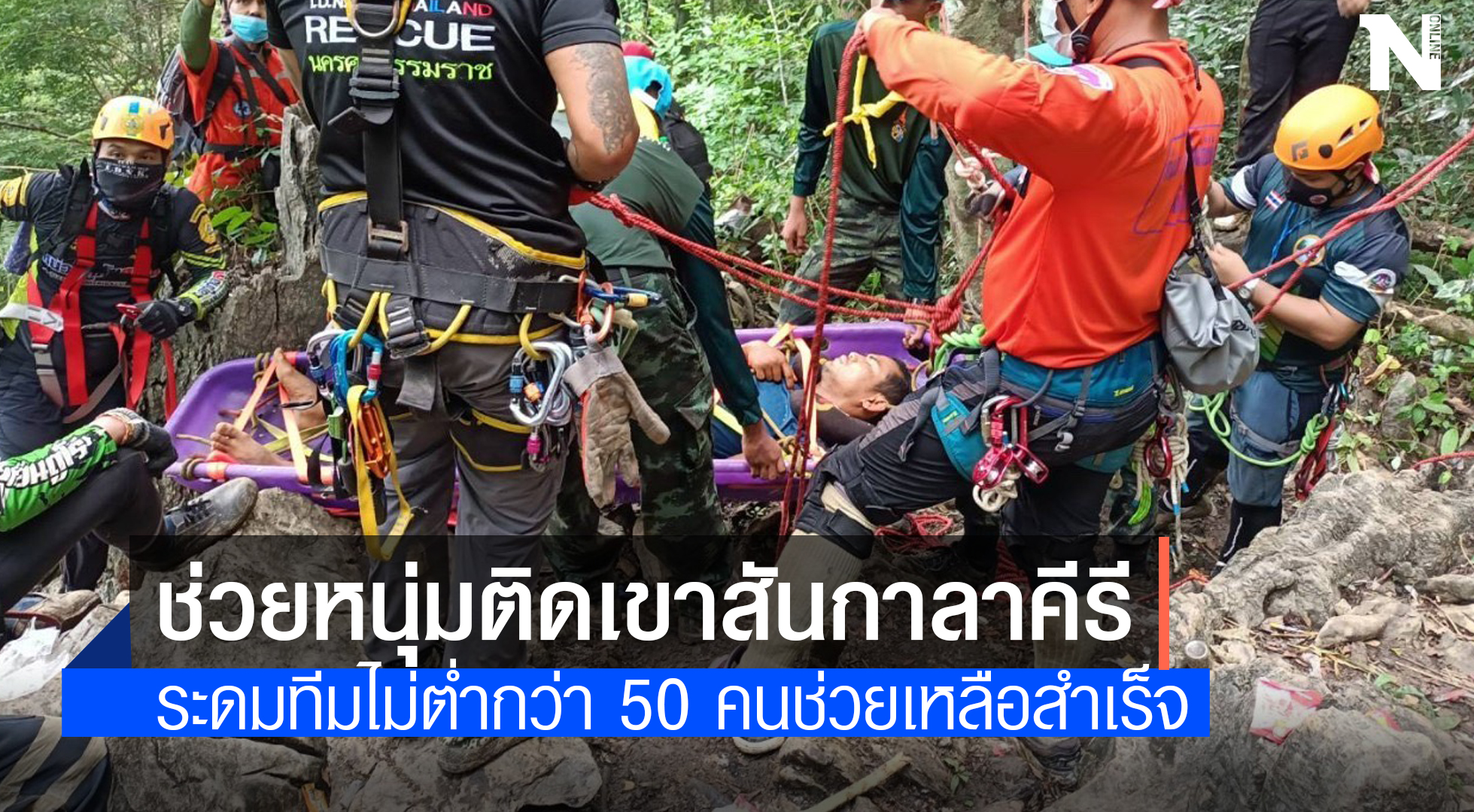 โดยเย็นวานนี้ (12 ก.ค.) ประธานมูลนิธิสยามรวมใจปู่อินทร์ จ.นครศรีธรรมราช อดีตเคยช่วยเหลือ หมูป่าที่เชียงราย และ อีก 6 หน่วยกู้ภัย ได้ร่วมกัน ประชุมเพื่อร่วมกันช่วยเหลือ ชายติดเขาสันคาราคีรี หลังได้รีบรายงานมีชาย 4 คนไปหาของป่าบนเขาสันคาราคีรี และ 1 ใน 4 ได้ โดนหินทับร่าง จนทำให้ได้รับบาดเจ็บ ซึ่งทั้ง 4 รายได้ขึ้นไปหาของป่า ที่บริเวณเขาสันกาลาคีรี ตั้งแต่วันที่ 3 ก.ค. 64 ที่ผ่านมาและใน วันที่ 10 ก.ค. 64 ทาง อบต.เกตรี ได้มีการรับรายงานผ่านมูลนิธิร่มไทย ว่ามีชายได้รับบาดเจ็บก้อนหินหล่นทับร่างติดอยู่บนเขา ไม่สามารถที่จะเดินทางกลับลงมาได้ จึงได้ประสานมูลนิธิร่มไทรให้การช่วยเหลือ ทางมูลนิธิร่วมไทรจึงได้ เดินทางเข้าไปให้การช่วยเหลือ แต่เนื่องจากเป็นพื้นที่ สูงชัน มีหินแหลม ยากลำบากที่จะ นำร่างลงมาได้ จึงได้ขอสนับสนุนหน่วยกู้ภัยจากพัทลุง จาก นคร จากตรัง จากสุราษธานี ร5 พัน2 อุทยานฯทะเลบัน หน่วยกู้ภัยดอกโดน และหน่วยกู้ภัยธรรมรังศรีสตูล โดยได้จัดชุดเป็น 4 ชุด ชุดแรกได้เอาน้ำ อาหาร เข้าไป และได้มีชุดที่ 2 ตามไป ให้การช่วยเหลือ และได้มีการประชุมแผนเพื่อติดตั้ง เสาสัญญาณอากาศ เพื่อที่จะทำการติดต่อประสานภาคพื้นดิน ซึ่งได้มีเจ้าหน้าที่ไม่ต่ำกว่า 50 ราย ที่อยู่บนเขา โดยแบ่งเป็น 2 ชุด ชุดที่อยู่กับคนเจ็บ และอีกชุดติดตั้งเสาสัญญาณ จนในที่สุดทุกฝ่ายได้ช่วยเหลือนำร่างชายบาดเจ็บลงมาจากเขาได้สำเร็จ