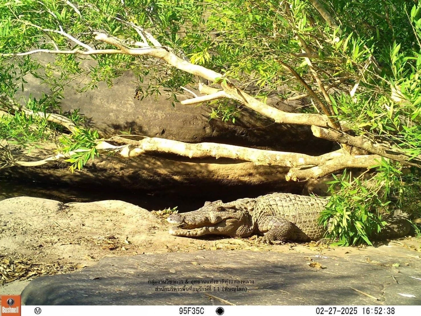 13 มีนาคม 2568 นายสมเกียรติ ยอดมาลี ผู้อำนวยการสำนักบริหารพื้นที่อนุรักษ์ที่ 11 เปิดเผยว่า ทีมนักวิจัยจากกลุ่มงานวิชาการ สำนักบริหารพื้นที่อนุรักษ์ที่ 11 (พิษณุโลก) โดยนางสาวแดงระวี พรหมรักษ์ นักวิชาการป่าไม้ปฏิบัติการ หัวหน้าโครงการวิจัยทรัพยากรสัตว์ป่ากับโครงการพัฒนาลุ่มน้ำคลองวังชมพู (เขื่อนวังชมพู) อุทยานแห่งชาติทุ่งแสลงหลวง จังหวัดพิษณุโลก พร้อมคณะ ประสบความสำเร็จในการบันทึกภาพ "จระเข้น้ำจืดสายพันธุ์ไทย" สัตว์ที่มีสถานะใกล้สูญพันธุ์อย่างยิ่งในธรรมชาติ บริเวณปากกะซาว คลองชมพู อำเภอเนินมะปราง จังหวัดพิษณุโลก ในเขตอุทยานแห่งชาติทุ่งแสลงหลวง เมื่อวันที่ 5 มีนาคม 2568 ภาพถ่ายที่ได้จากกล้องดักถ่ายสัตว์ป่า แสดงให้เห็นจระเข้ขนาดใหญ่กำลังนอนอาบแดดบนโขดหินริมน้ำ ท่ามกลางสภาพแวดล้อมที่มีต้นไม้และพุ่มไม้ปกคลุม