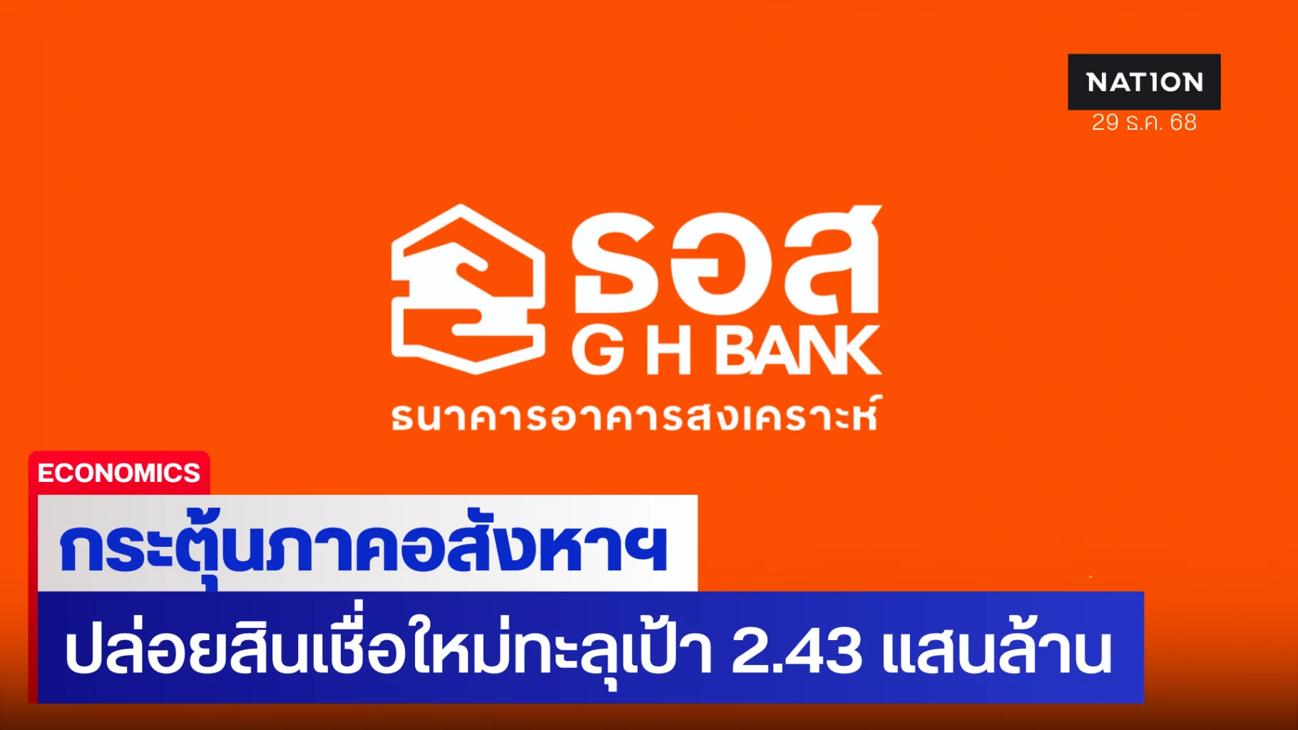 ดร.มหัทธนะ อัมพรพิสิฏฐ์ กรรมการผู้จัดการธนาคารอาคารสงเคราะห์ (ธอส.) เปิดเผยว่า ณ วันที่ 29 ธันวาคม 2568 ธอส. สามารถปล่อยสินเชื่อใหม่จำนวนกว่า 243,000 ล้านบาท สูงกว่าเป้าหมายปี 2568 ที่ตั้งไว้ 241,780 ล้านบาท ซึ่งเป็นส่วนสำคัญในการอัดฉีดเม็ดเงินลงสู่ระบบเศรษฐกิจ ผลักดันภาคอสังหาริมทรัพย์ รวมถึงธุรกิจก่อสร้าง วัสดุอุปกรณ์ และการจ้างงานฟื้นตัวขึ้น