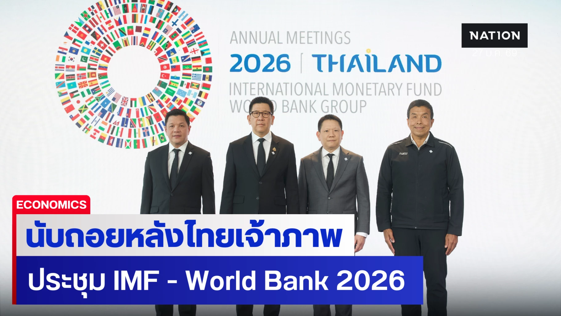 กระทรวงการคลัง ร่วมกับธนาคารแห่งประเทศไทย และกรุงเทพมหานคร ประกาศความพร้อม เปิดตัวแลนด์มาร์ก ในการจัดการประชุมประจำปีสภาผู้ว่าการกองทุนการเงินระหว่างประเทศ และกลุ่มธนาคารโลก ปี 2569 (2026 International Monetary Fund (IMF) - World Bank Group Annual Meetings) เพื่อสนับสนุนความเชื่อมั่นของประชาคมโลกต่อบทบาท และศักยภาพของไทยในฐานะศูนย์กลางการประชุม และความร่วมมือด้านเศรษฐกิจ และการเงินระดับนานาชาติ เมื่อวันที่ 27 มกราคม 2569 ณ ศูนย์การประชุมแห่งชาติสิริกิติ์