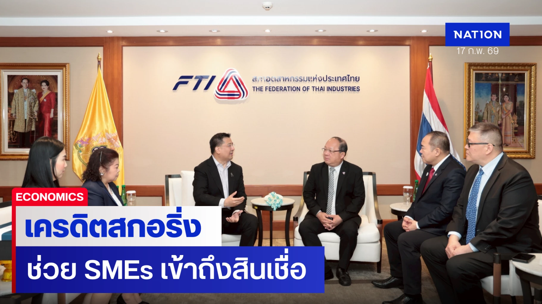 ดร.สิทธิกร ดิเรกสุนทร กรรมการและผู้จัดการทั่วไป บรรษัทประกันสินเชื่ออุตสาหกรรมขนาดย่อม (บสย.) พร้อมด้วย นางดุสิดา ทัพวงษ์ รองกรรมการผู้จัดการอาวุโส สายงานบริหารช่องทางและพัฒนาผู้ประกอบการ และทีมงาน เข้าพบ นายเกรียงไกร เธียรนุกุล ประธานสภาอุตสาหกรรมแห่งประเทศไทย (ส.อ.ท.) นายอภิชิต ประสพรัตน์ รองประธาน ส.อ.ท. และคณะผู้บริหาร สถาบันวิสาหกิจขนาดกลางและขนาดย่อมอุตสาหกรรมการผลิต (SMI) เมื่อวันที่ 13 กุมภาพันธ์ 2569 ณ สภาอุตสาหกรรมแห่งประเทศไทย เพื่อหารือแนวทางความร่วมมือสนับสนุนผู้ประกอบการไทยใน 3 ประเด็นหลัก ได้แก่
