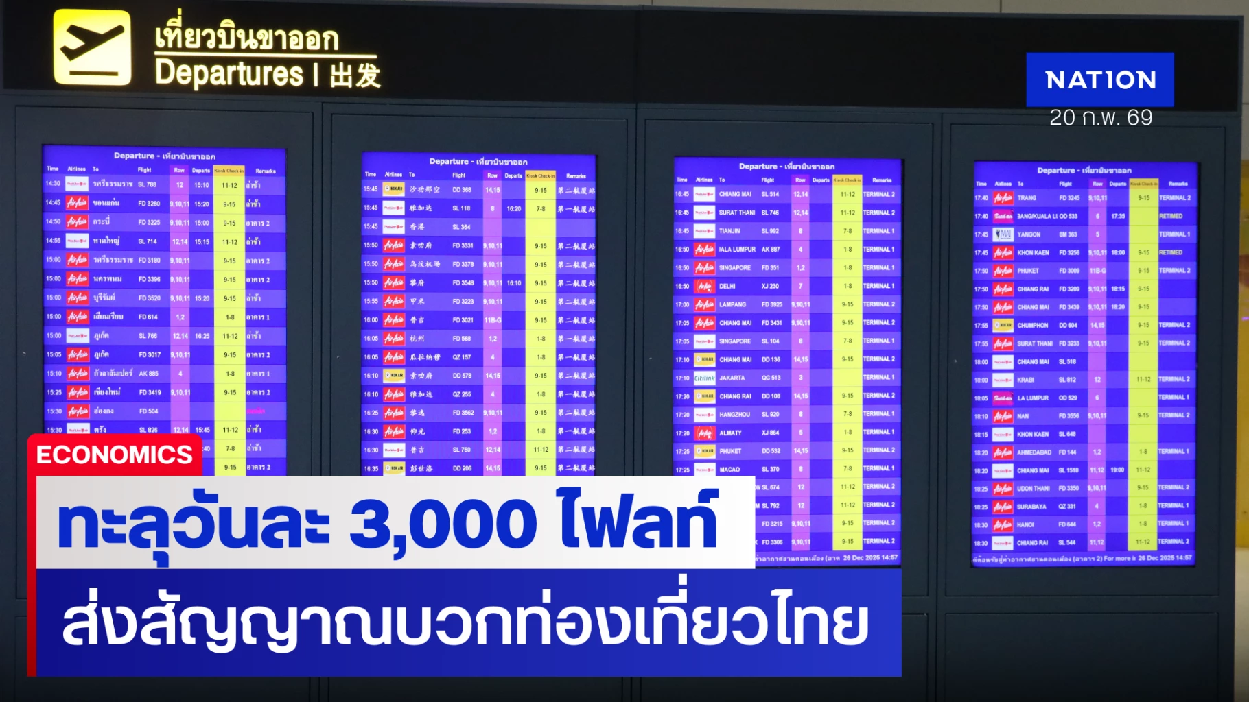 โดยคาดการณ์ว่าจะมีปริมาณเที่ยวบิน รวมทั้งสิ้น 29,096 เที่ยวบิน หรือเฉลี่ยวันละ 2,910 เที่ยวบิน เพิ่มขึ้นร้อยละ 8.3 เมื่อเทียบกับช่วงเดียวกันของปี 2568 สำหรับเที่ยวบินระหว่างประเทศ พบว่าเส้นทางประเทศไทย–จีน มีปริมาณสูงสุดเป็นอันดับหนึ่ง เฉลี่ยวันละประมาณ 330 เที่ยวบิน และมีสัญญาณฟื้นตัวอย่างมีนัยสำคัญ ช่วงหลังเดือนมกราคม 2569 ขณะที่เส้นทางประเทศไทย–อินเดีย มีปริมาณเฉลี่ยวันละ 130 เที่ยวบิน และเส้นทางประเทศไทย–มาเลเซีย เฉลี่ยวันละ 98 เที่ยวบิน ซึ่งทั้งสองเส้นทาง มีแนวโน้มเพิ่มขึ้นอย่างต่อเนื่องเช่นกัน ส่วนสนามบินหลักของประเทศที่มีปริมาณเที่ยวบินหนาแน่นในช่วงเทศกาลตรุษจีน ได้แก่ ท่าอากาศยานสุวรรณภูมิ เฉลี่ยวันละ 1,150 เที่ยวบิน ท่าอากาศยานดอนเมือง เฉลี่ยวันละ 700 เที่ยวบิน ท่าอากาศยานภูเก็ต เฉลี่ยวันละ 380 เที่ยวบิน และท่าอากาศยานเชียงใหม่ เฉลี่ยวันละ 220 เที่ยวบิน ทั้งนี้ ตัวเลขดังกล่าวสะท้อนถึงความเชื่อมั่นของนักท่องเที่ยวและการฟื้นตัวอย่างต่อเนื่องของตลาดการเดินทางระหว่างประเทศ โดยคาดว่าเที่ยวบินจากประเทศจีนมายังประเทศไทยจะทยอยเพิ่มขึ้นอย่างต่อเนื่องในระยะต่อไป