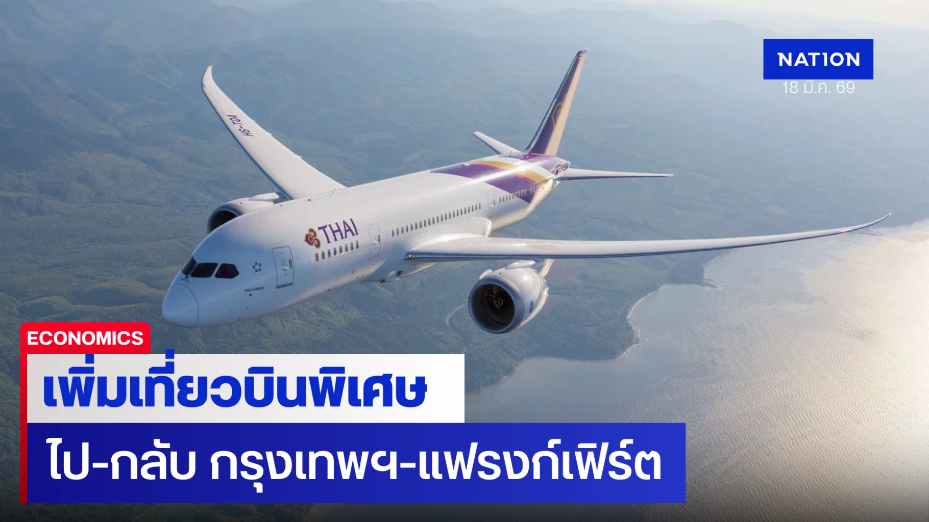 บริษัท การบินไทย จำกัด (มหาชน) เพิ่มเที่ยวบินพิเศษในเส้นทางไป-กลับ กรุงเทพฯ-แฟรงก์เฟิร์ต ในวันที่ 21 มีนาคม 2569 เพื่อช่วยบรรเทาปริมาณผู้โดยสารตกค้าง และรองรับความต้องการเดินทางที่เพิ่มมากขึ้น สำรองที่นั่งได้ตั้งแต่วันนี้เป็นต้นไป มีรายละเอียดเที่ยวบินดังนี้