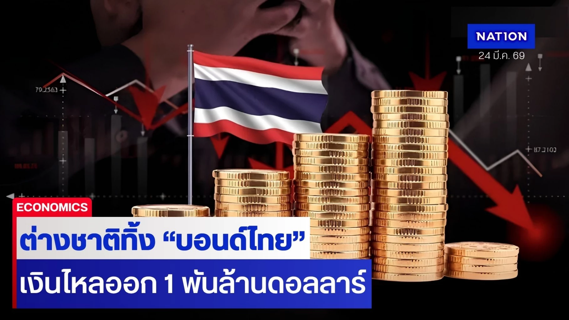ข้อมูลจากสมาคมตลาดพันธบัตรไทย (ThaiBMA) ชี้ให้เห็นว่า เฉพาะวันศุกร์ ที่ 20 มี.ค.69 ที่ผ่านมาวันเดียว นักลงทุนต่างชาติถอนเงินออกไปถึง 1,200 ล้านดอลลาร์ ซึ่งถือเป็นยอดขายต่อวันสูงสุดนับตั้งแต่เดือนมี.ค.2565