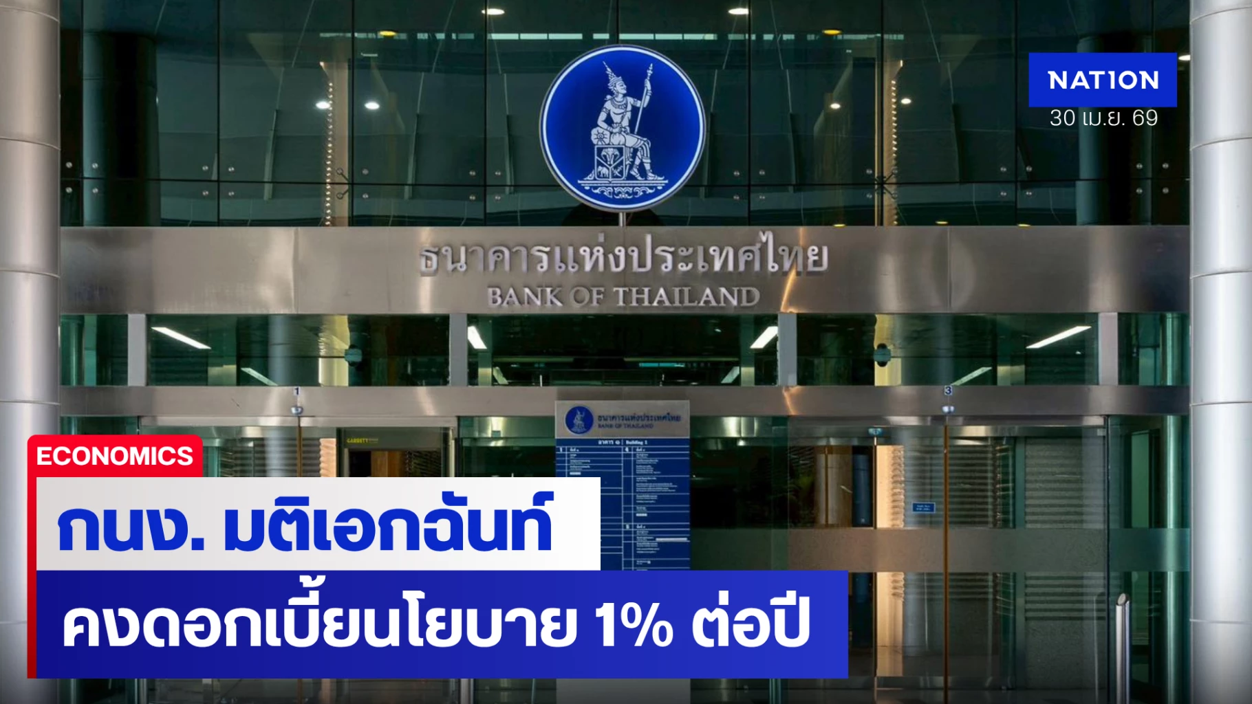 กนง. มีมติเป็นเอกฉันท์ 6 เสียง ให้คงอัตราดอกเบี้ยนโยบายไว้ที่ 1% ต่อปี ชี้เศรษฐกิจไทยมีแนวโน้มขยายตัวชะลอลงจากสงครามตะวันออกกลาง