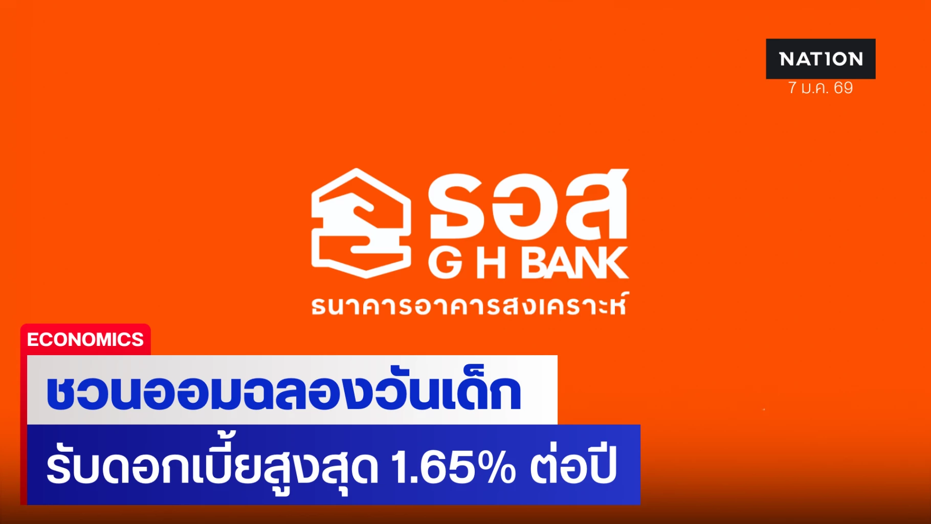 ธนาคารอาคารสงเคราะห์ (ธอส.) ร่วมส่งเสริมวินัยการออมเนื่องในเทศกาลวันเด็กแห่งชาติ ประจำปี 2569 สำหรับเด็กไทยที่มีอายุไม่เกิน 15 ปีบริบูรณ์ ออมเงินกับเงินฝากออมทรัพย์ “เก็บออม” จะได้รับผลตอบแทนจากอัตราดอกเบี้ยสูงถึง 1.65% ต่อปี (สำหรับลูกค้าที่มียอดเงินฝากคงเหลือไม่เกิน 200,000 บาท)