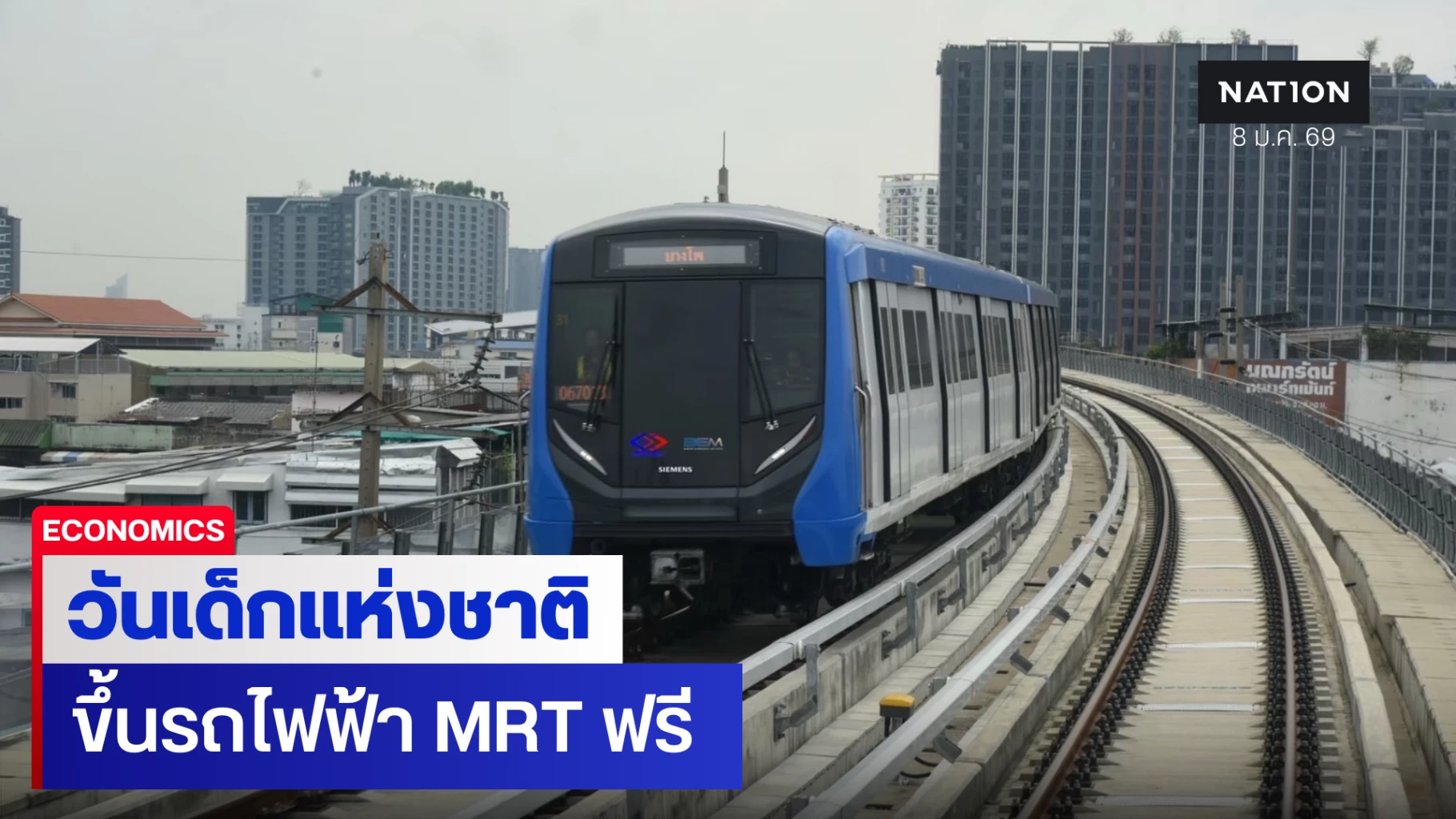 การรถไฟฟ้าขนส่งมวลชนแห่งประเทศไทย (รฟม.) ร่วมกับ บริษัท ทางด่วนและรถไฟฟ้ากรุงเทพ จำกัด (มหาชน) (BEM) ผู้ให้บริการเดินรถไฟฟ้ามหานคร สายเฉลิมรัชมงคล (MRT สายสีน้ำเงิน) และรถไฟฟ้ามหานคร สายฉลองรัชธรรม (MRT สายสีม่วง) บริษัท อีสเทิร์น บางกอกโมโนเรล จำกัด (EBM) ผู้ให้บริการเดินรถไฟฟ้ามหานคร สายนัคราพิพัฒน์ (MRT สายสีเหลือง) และบริษัท นอร์ทเทิร์น บางกอกโมโนเรล จำกัด (NBM) ผู้ให้บริการเดินรถไฟฟ้ามหานคร สายวิวัฒน์นคร (MRT สายสีชมพู) เตรียมส่งมอบความสุข พร้อมเสริมสร้างประสบการณ์ ในการใช้ระบบขนส่งสาธารณะทางรางให้แก่เด็กๆ เนื่องในวันเด็กแห่งชาติ ประจำปี 2569 ด้วยการโดยสารรถไฟฟ้ามหานคร ฟรี! ครบทั้ง 4 สาย ในวันเสาร์ที่ 10 มกราคม 2569 ตลอดระยะเวลาให้บริการ รายละเอียดดังนี้