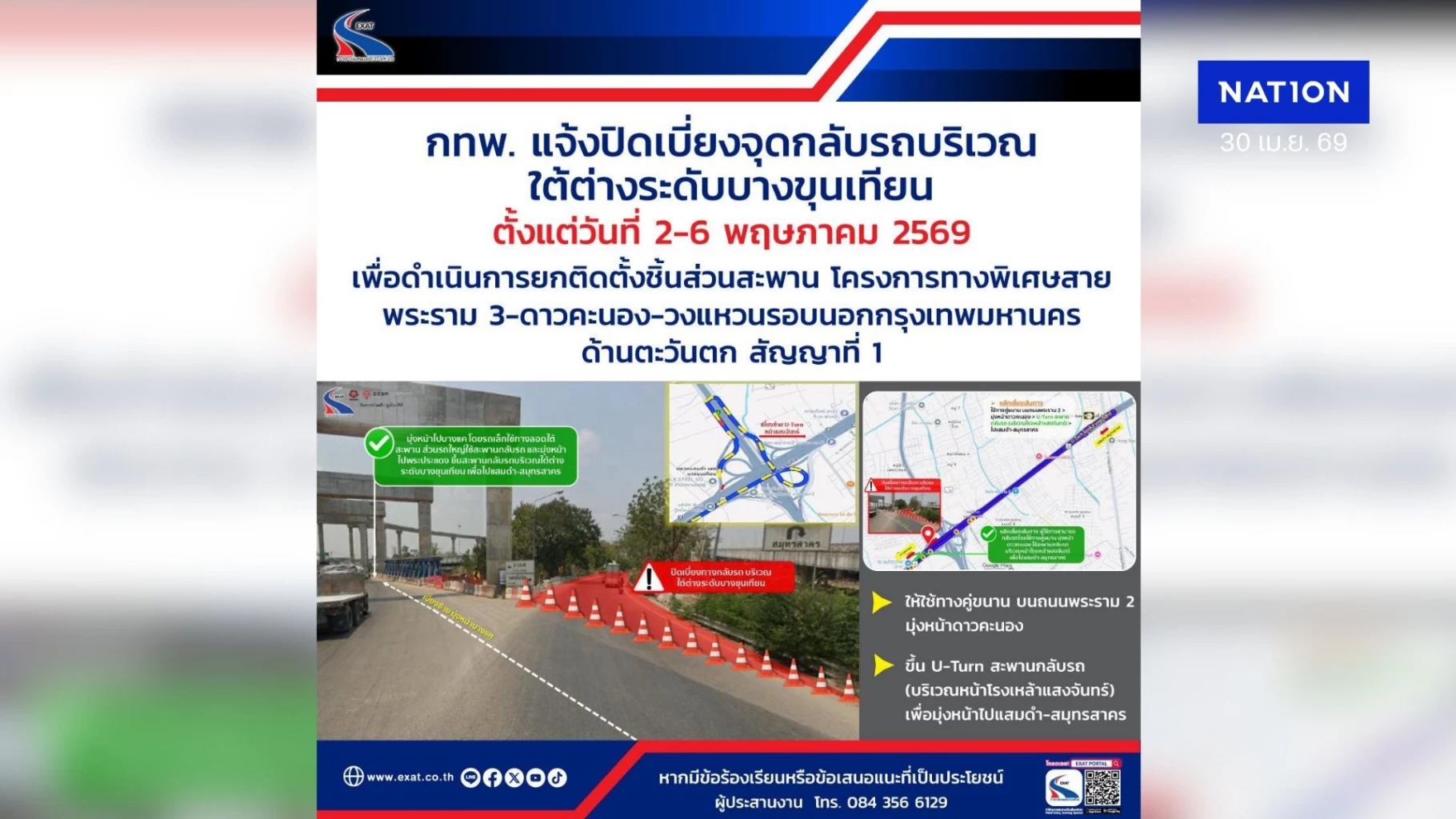 โดยผู้รับจ้างจะดำเนินงานยกติดตั้งชิ้นส่วนสะพานของโครงการดังกล่าว จึงมีความจำเป็นต้องปิดเบี่ยงจุดกลับรถ บริเวณใต้ทางต่างระดับบางขุนเทียน 🚧โดยปิดเบี่ยงจุดกลับรถ (ฝั่งขาเข้าไปแสมดำ-สมุทรสาคร) ตั้งแต่วันที่ 2-6 พฤษภาคม 2569 โดยผู้ใช้ทางสามารถใช้เส้นทางทดแทนชั่วคราว ได้ดังนี้