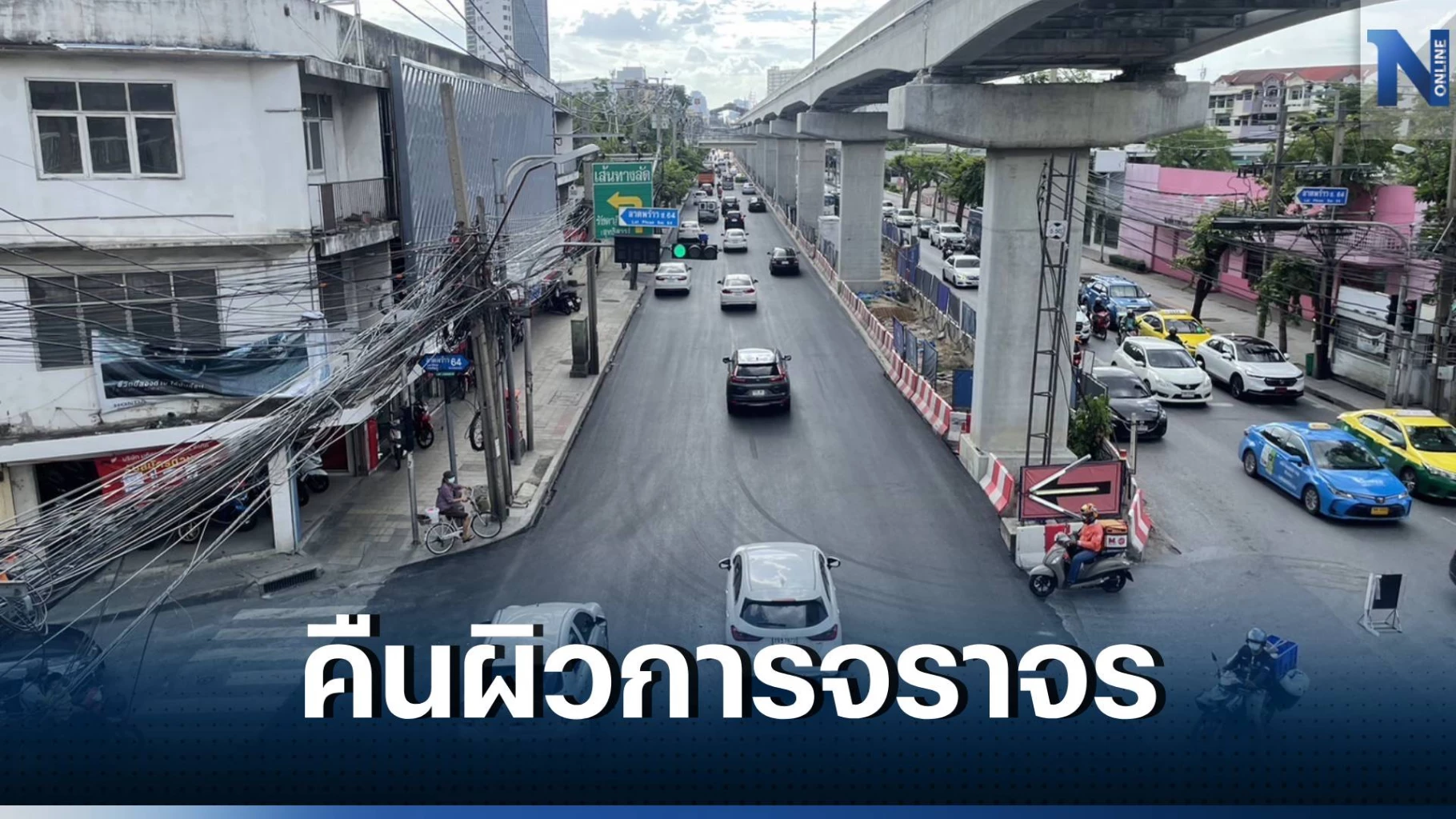 โดยปัจจุบัน โครงการฯ ได้คืนผิวจราจรบนถนนลาดพร้าว ฝั่งขาเข้า ตั้งแต่บริเวณซอยลาดพร้าว 74 - 60 ระยะทางรวม 1 กิโลเมตร โดยดำเนินการปูยางมะตอย (Asphalt) เรียบร้อยแล้ว สำหรับถนนศรีนครินทร์ ได้ดำเนินการคืนผิวจราจรแล้วในบริเวณช่วงจุดตัดทางหลวงพิเศษ มอเตอร์เวย์ (หมายเลข7) ถึง ทางรถไฟสายตะวันออก ฝั่งขาออก ระยะทางประมาณ 300 เมตร และบริเวณคลองบางนา ถึงเชิงสะพานข้ามแยกศิครินทร์ ฝั่งขาออก โดยจะดำเนินการปูยางมะตอย (Asphalt) และจะดำเนินการตีเส้นจราจร รวมถึงเครื่องหมายจราจรต่อไป