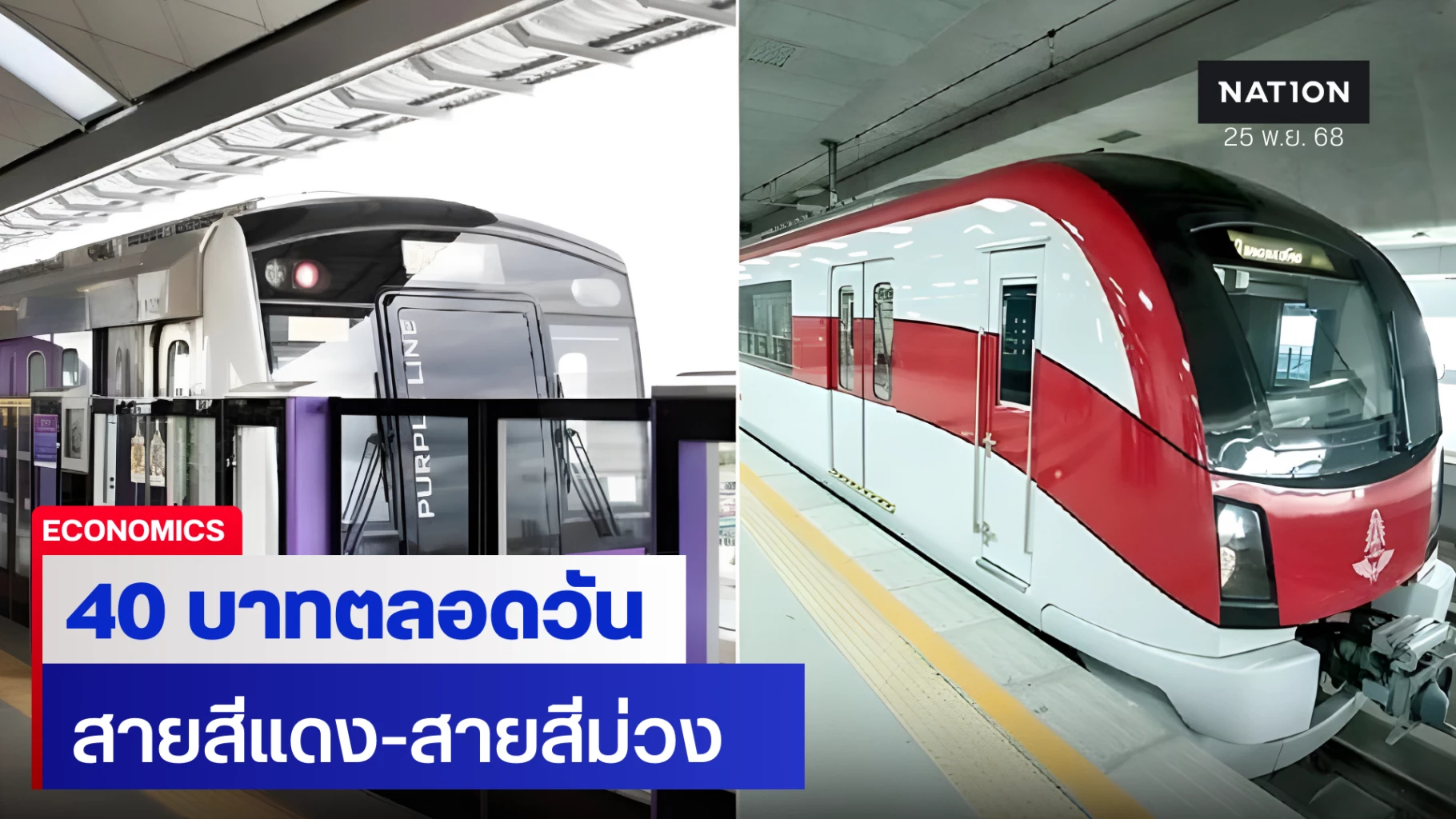 ครม. มีมติเห็นชอบมาตรการค่าโดยสารรถไฟฟ้าสายสีแดง และสายสีม่วง ในอัตราสูงสุด 40 บาทต่อวัน ดีเดย์ 1 ธ.ค.นี้ถึง 30 พ.ย. 69 แทนที่นโยบาย 20 บาทตลอดสายเดิม