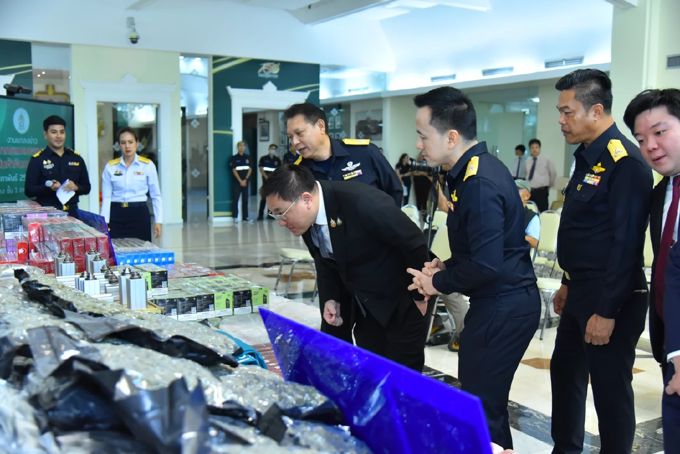 นายจุลพันธ์ อมรวิวัฒน์ รัฐมนตรีช่วยว่าการกระทรวง การคลัง เป็นประธานในการแถลงข่าว กรมศุลกากรแถลงผลการจับกุมสินค้าผิดกฎหมายในช่วง 4 เดือนแรกของปีงบประมาณ 2568 มูลค่ากว่า 780 ล้านบาท” ร่วมด้วย นายสุรชาติ เทียนทอง ผู้ช่วยเลขานุการรัฐมนตรีว่าการกระทรวงการคลัง (ปฏิบัติหน้าที่เลขานุการรัฐมนตรีช่วยว่าการกระทรวงการคลัง นายจุลพันธ์ อมรวิวัฒน์) นายพลนชชา จักรเพ็ชร ที่ปรึกษารัฐมนตรีช่วยว่าการกระทรวงการคลัง นายพันธ์ทอง ลอยกุลนันท์ ที่ปรึกษาด้านการพัฒนาและบริหารการจัดเก็บภาษี นางนันท์ฐิตา ศิริคุปต์ ที่ปรึกษาด้านพัฒนาระบบควบคุมทางศุลกากร นางกิจจาลักษณ์ ศรีนุชศาสตร์ ที่ปรึกษาด้านพัฒนาระบบสิทธิประโยชน์ทางศุลกากร นายยุทธนา พูลพิพัฒน์ รองอธิบดีกรมศุลกากร และ นายดิเรก คชารักษ์ รองอธิบดีกรมศุลกากร ณ ห้องโถง อาคาร 1 กรมศุลกากร