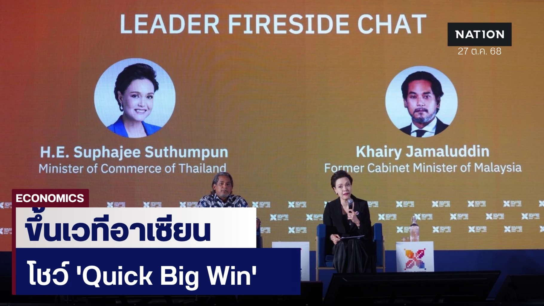นางศุภจี สุธรรมพันธุ์ รัฐมนตรีว่าการกระทรวงพาณิชย์ เป็นผู้แทนนายกรัฐมนตรี อนุทิน ชาญวีรกูล ขึ้นเวทีสนทนาแสดงวิสัยทัศน์ด้านเศรษฐกิจของรัฐบาลไทย ซึ่งจัดโดย สภาธุรกิจอาเซียน ในห้วงสัปดาห์ของการประชุมสุดยอดอาเซียน ณ กรุงกัวลาลัมเปอร์ มาเลเซีย โดยมีผู้เข้าร่วมงานจากภาคธุรกิจต่าง ๆ ในอาเซียนมากกว่า 500 คน