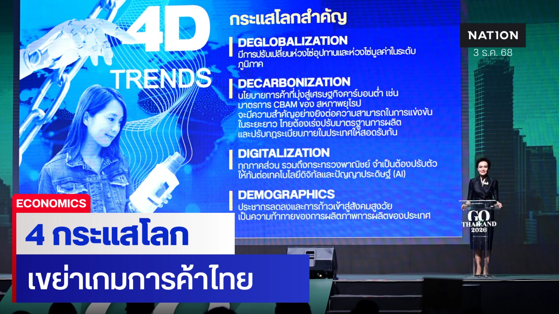 “แม้ 4 กระแสโลกจะสร้างแรงกดดันต่อระบบการค้า แต่ก็เปิดช่องโอกาสใหม่ หากไทยสามารถมองเห็นจังหวะและวางตัวให้เหมาะสม” นางศุภจี กล่าว