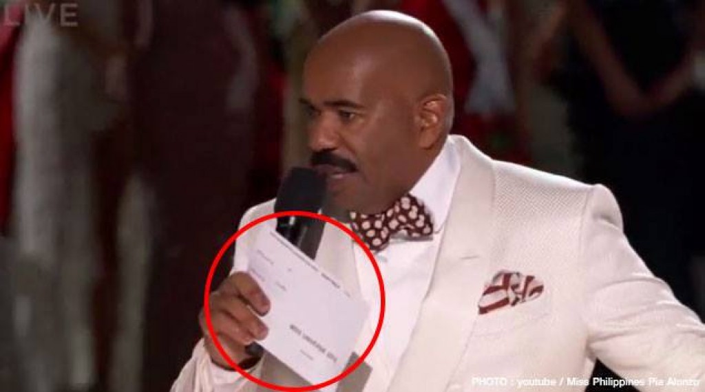 ตะลึงกันไปทั้งโลก เมื่อ "สตีฟ ฮาร์วีย์" พิธีกรงานประกวดมิสยูนิเวิร์ส 2015 ประกาศผล ผู้คว้ามงกุฎ มิสยูนิเวิร์ส 2015 ผิด เราลองไปดูกันชัดๆ ว่า ใบประกาศที่ที่นาย "สตีฟ ฮาร์วีย์" ซึ่งหลายคนสงสัย ว่าเป็นสาวงามจากประเทศใด ได้ตำแหน่งกันแน่