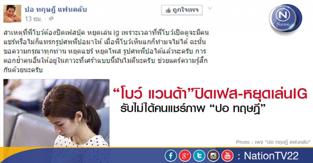 "สาเหตุที่พี่โบว์ต้องปิดเฟสบุ๊ค หยุดเล่น ig เพราะเวลาที่พี่โบว์เปิดดูจะมีคนแชร์หรือไม่ก็แทรกรูปศพพี่ปอมาให้ เมื่อพี่โบว์เห็นแกก็ทำใจไม่ได้ ฉะนั้นขอความกรุณาทุกท่าน หยุดแชร์ หยุดโพสต์ รูปศพพี่ปอได้แล้วนะครับ การตอกย้ำคนอื่นให้อยู่ในภาวะที่เศร้าแบบนี้มันไม่ดีนะครับ ช่วยแคร์ความรู้สึกกันด้วยนะครับ"