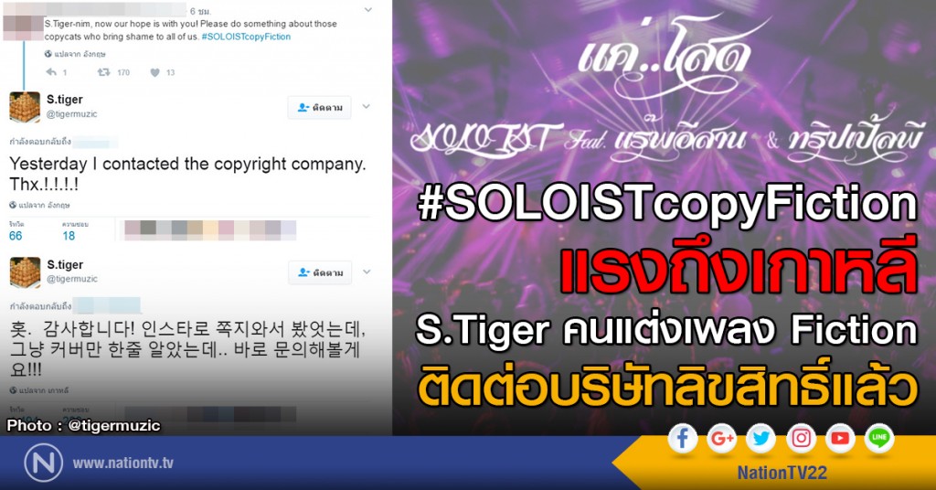 ล่าสุดแฟนคลับชาวไทยทำการ mention เรื่องราวดังกล่าวไปบอก Shinsadong Tiger หนึ่งในผู้แต่งเพลง Fiction ผ่านทวิตเตอร์ @tigermuzic โดยระบุข้อความซึ่งทาง NationTV ขออนุญาตแปลเป็นภาษาไทยว่า "คุณ S.tiger ตอนนี้ความหวังของพวกเราอยู่ที่คุณ ช่วยทำอะไรซักอย่างกับการลอกเลียนนั้นที่สร้างความอับอายให้พวกเรา" และเจ้าตัวได้ตอบกลับแล้วว่า ติดต่อบริษัทลิขสิทธิ์เรียบร้อยแล้ว และขอบคุณครับ