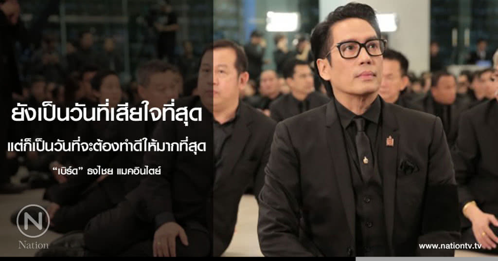 "เอิ่ม...ความรู้สึกไม่มีการเปลี่ยนแปลง วันที่ใจเราหลุดออกไป (น้ำตาคลอ) แต่วันนี้เป็นวันที่เราต้องปฏิญาณตนกับตัวเองมากกว่า การสูญเสียถือว่าเป็นการให้เราคิดได้ว่าเราจะปฏิญาณกับตัวเองอย่างไร ต่อไปนี้เป็นต้นไปเราต้องเดินไปข้างหน้า พร้อมกับพระองค์ท่านที่ยังอยู่ในใจของเราทุกคน ใครที่คิดว่าจะทำอะไร ตอนนี้เป็นโอกาสของพวกเราแล้ว ที่จะทำดีให้กับตัวเองกับครอบครัว กับคนที่เรารัก เลยไปถือสังคมและประเทศชาติด้วย ถึงเวลาที่เราจะต้องเจริญเติบโตไปด้วยความมั่นคง ด้วยคำสอนของพระองค์ท่าน พระองค์ไม่ได้เป็นแต่พระมหากษัตริย์ของประเทศไทย ท่านเป็น King of the world ฉะนั้นทุกคำพูด ทุกไอเดียของพระองค์ท่าน ประเสริฐที่สุด พวกเราเป็นคนไทยควรจะเป็นคนที่ภาคภูมิใจที่สุดในโลก วันนี้เป็นวันที่เราเสียใจที่สุด แต่เป็นวันที่เราจะต้องทำดีให้มากที่สุด ปฏิญาณตนกับตัวเองให้ได้มากที่สุด แล้วก็ต้องทำให้ได้เท่ากับ หรือคล้ายมากที่สุดกับที่เราสัญญากับพระองค์" ซูเปอร์สตาร์ชื่อดังเผย