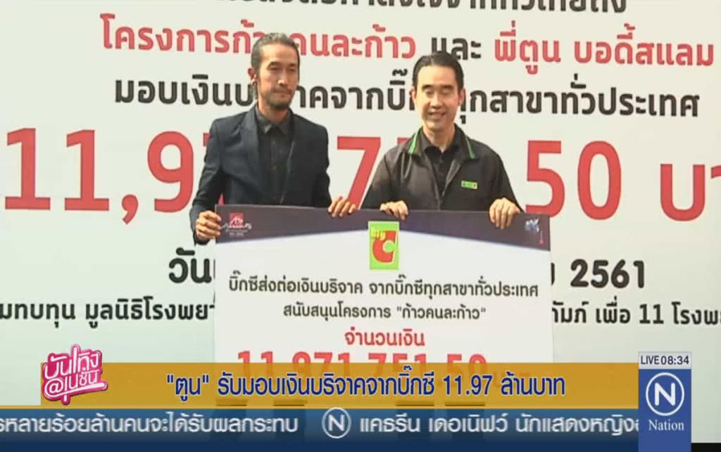 กลายเป็นขวัญคนไทยทั้งประเทศไปแล้ว สำหรับ"ตูน บอดี้สแลม" การเดินทางมารับเงินครั้งนี้ก็มีแฟนๆมารอต้อนรับกันจนล้นห้าง เมื่อตูนเดินทางมาถึงทางประธานเจ้าหน้าที่บริหารและคณะผู้บริหารของบิ๊กซีก็ได้ร่วมส่งเงินบริจาคจำนวน 11,971,751.50 บาท ที่ประชาชนทุกคนได้ร่วมกันบริจาคผ่านกล่องบริจาคจากบิ๊กซีทุกสาขาทั่วประเทศให้กับตูนสนับสนุนโครงการก้าวคนละก้าวเพื่อระดมทุนช่วยเหลือ 11 โรงพยาบาลศูนย์ทั่วประเทศ และครั้งนี้ตูนก็ได้ฝากขอบคุณทุกๆหน่วยงานบนเวทีด้วย บรรยากาศภายในงานนั้นอบอุ่นมากจริงๆค่ะงานนี้นอกจากมารับเงินบริจาคแล้ว ตูนยังนำลูกฟุตบอลมามอบให้กับเด็กๆโรงเรียนต่างๆเพื่อเป็นของขวัญในวันเด็กแห่งชาติที่กำลังจะมาถึงด้วย