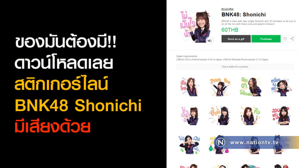 ล่าสุดทางBNK48 ร่วมมือกับทางไลน์ เอาใจสาวกบีเอ็นเค48 อีกครั้งจัดสติกเกอร์ไลน์ Shonichi หรือแปลภาษไทยคือวันแรก กับเซมบัตสึทั้ง 16 สาวให้หัวใจทุกคนได้หวั่นไหว โดยคราวนี้ได้เพิ่มลูกเล่นให้แต่ละสติกเกอร์ไลน์มีเสียงของสาวๆให้แฟนคลับได้ฟินไปพร้อมกับความน่ารัก แสนซนของพวกเธออีกด้วย