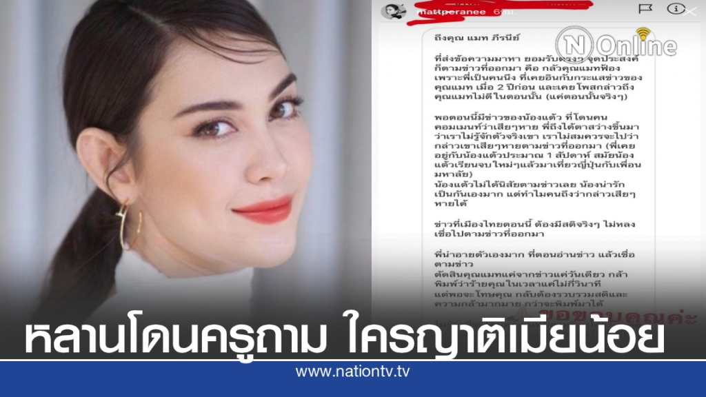 ล่าสุดรายการ เรื่องเล่าเสาร์อาทิตย์ นางเอกสาว แมท ภีรนีย์ ได้สัมภาษณ์เปิดใจครั้งแรกทั้งน้ำตาว่า "เจ้าตัวก็ยอมรับว่าตนเองต้องทนเจอเรื่องแบบนี้มานานเกือบ 2 ปีแล้ว ตอนแรกคิดว่าการที่อยู่นิ่งๆ แล้วความจริงจะปรากกฎ เอาความดีเข้าสู้ ไม่อยากจะสู้รบกับใคร แต่ก็ยังมีคนเข้ามาด่า มาต่อว่าเยอะอยู่ ที่สำคัญคือไปว่าถึงพ่อ ถึง แม่ แม่ไม่มีความสุขเลยตลอด 2 ปี