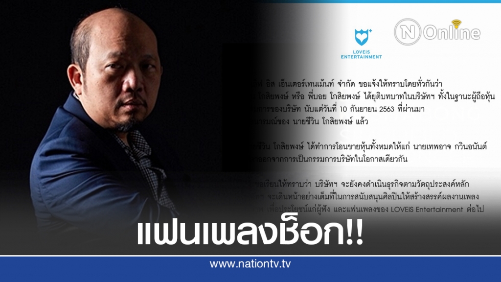 เมื่อวันที่ 1 ต.ค.63 แฟนเพจ LOVEiS ออกประกาศระบุข้อความว่า "บริษัท เลิฟ อิส เอ็นเตอร์เทนเม้นท์ จำกัด ขอแจ้งให้ทราบ โดยทั่วกันว่า บัดนี้ นาย ชีวิน หรือ พี่บอย โกสิยพงษ์ ได้ยุติบทบาทในบริษัท ทั้งในฐานะผู้ถือหุ้น และกรรมการของบริษัทแล้วนับแต่วันที่ 10 กันยายน 2563 โดยพี่บอยได้ทำการโอนขายหุ้นจำนวนร้อยละ 50 ที่ถืออยู่ในบริษัทให้แก่นายเทพอาจ กวินอนันต์ และได้ลาออกจากการเป็นกรรมการบริษัทในโอกาสเดียวกัน