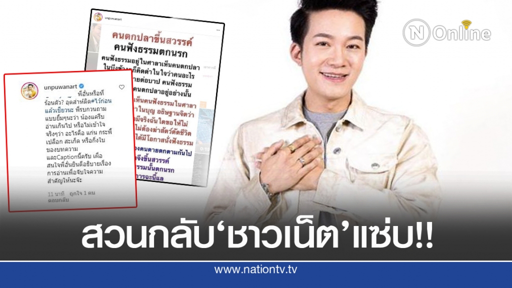 เมื่อถึงคราวทั้งสองคนตายตกตามกันไปคนที่ตกปลาจึงขึ้นสวรรค์ ส่วนคนที่ฟังธรรมนั้นตกนครด้วยประการฉะนี้แล"พร้อมเขียนแคปชั่นว่า "แค่คิดว่ารู้มากกว่า ฉลาดกว่า ดีกว่า ก็โง่กว่าแล้ว #พี่ไม่ได้พูดเรื่องการเมือง #อย่าเพิ่งรู้สึกว่าถูกด่า #ธรรมะแบบอั๋นๆ"