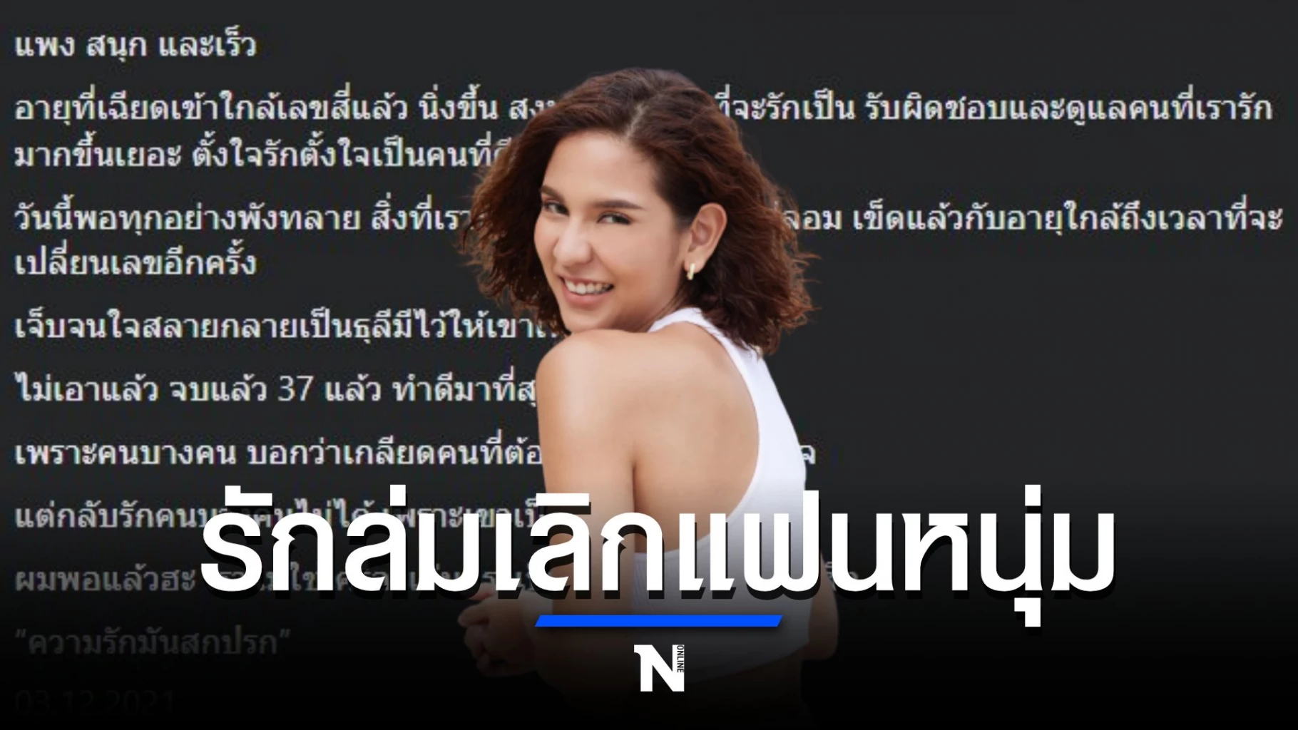 จากนั้นเจ้าตัวโพสต์ข้อความปริศนาถึงเหตุผลที่เลิกรากันว่า เคยเล่นรถไฟเหาะไหมฮะ? แพง สนุก และเร็ว อายุที่เฉียดเข้าใกล้เลขสี่แล้ว นิ่งขึ้น สงบพอสมควรที่จะรักเป็น รับผิดชอบ และดูแลคนที่เรารักมากขึ้นเยอะ ตั้งใจรัก ตั้งใจเป็นคนที่ดี วันนี้พอทุกอย่างพังทลาย สิ่งที่เราทำไปคือเหมือนเรื่องปลอม เข็ดแล้วกับอายุใกล้ถึงเวลาที่จะเปลี่ยนเลขอีกครั้ง