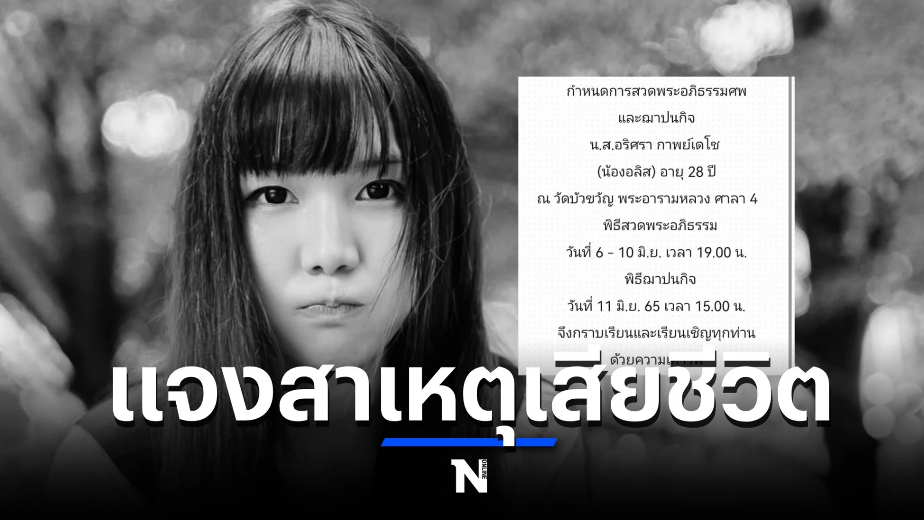 ความคืบหน้ากรณี “น้องอลิส” อริศรา กาพย์เดโช อายุ 28 ปี นางแบบและเน็ตไอดอลชื่อดัง เสียชีวิตกะทันหันเมื่อช่วงเที่ยงวานนี้ (6 มิ.ย.) จนสร้างความแตกตื่นตกใจให้ครอบครัว เพื่อนในวงการ และบรรดาแฟนคลับเป็นอย่างมาก เนื่องจากเป็นบุคคลที่มุ่งมั่นจนสร้างชื่อเสียงให้ตัวเอง (คลิก อ่านประวัติน้องอลิส)