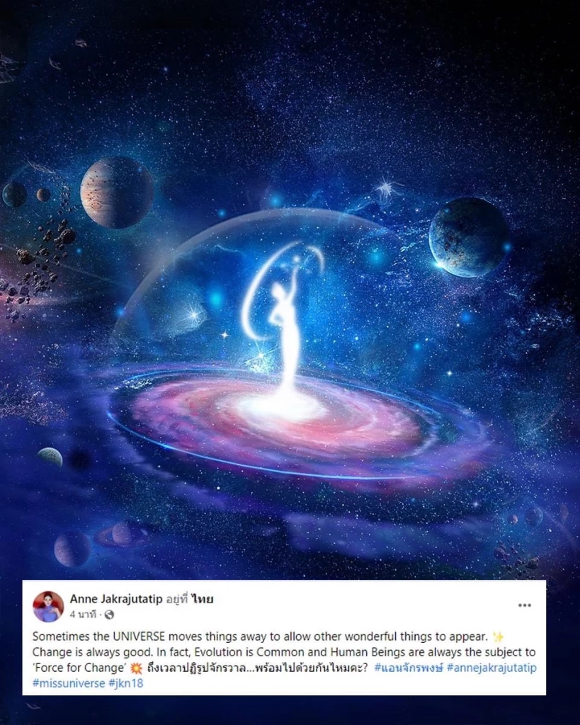 โดยเธอได้โพสต์ข้อความผ่านทาง FB:Anne Jakrajutatip โดยระบุข้อความว่า…. Sometimes the UNIVERSE moves things away to allow other wonderful things to appear. Change is always good. In fact, Evolution is Common and Human Beings are always the subject to 'Force for Change' ถึงเวลาปฏิรูปจักรวาล...พร้อมไปด้วยกันไหมดะ? #แอนจักรพงษ์ #annejakrajutatip #missuniverse #jkn18