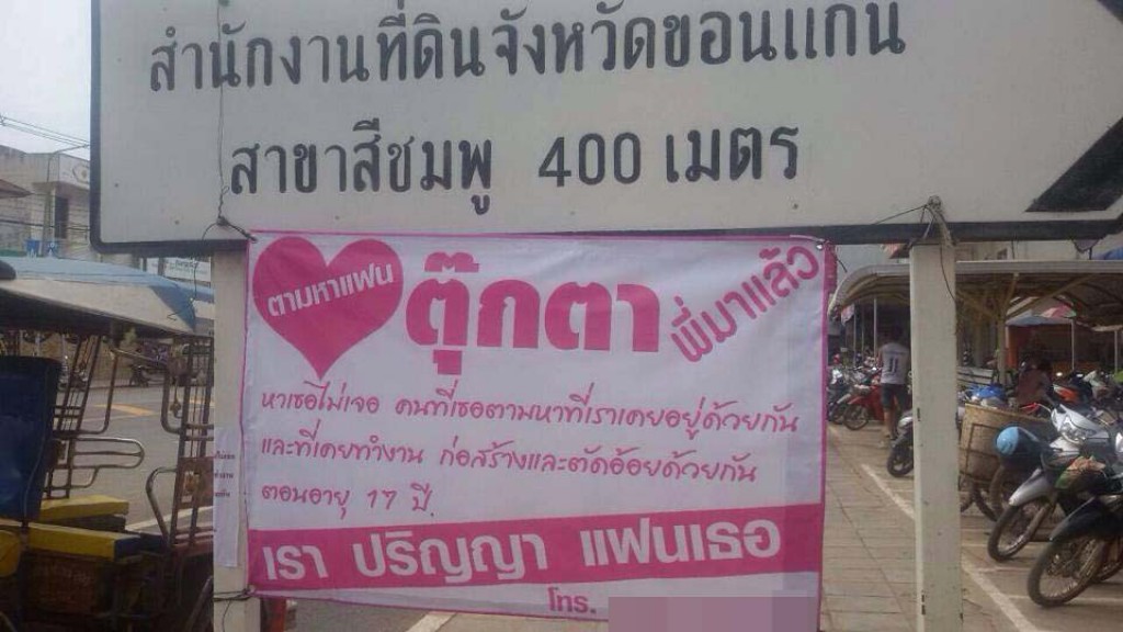 ขอนแก่น - หนุ่มอุทัยธานี ขึ้นป้ายประกาศตามหาอดีตแฟน ซึ่งไม่เจอกันมา 23 ปี แต่ความรักถูกพ่อตากีดกัน ขึ้นป้ายไวนิล ติดอยู่หน้าสำนักงานที่ดิน พร้อมให้เบอร์โทรฯ ติดต่อกลับ แค่อยากรู้ว่าสบายดีไหม