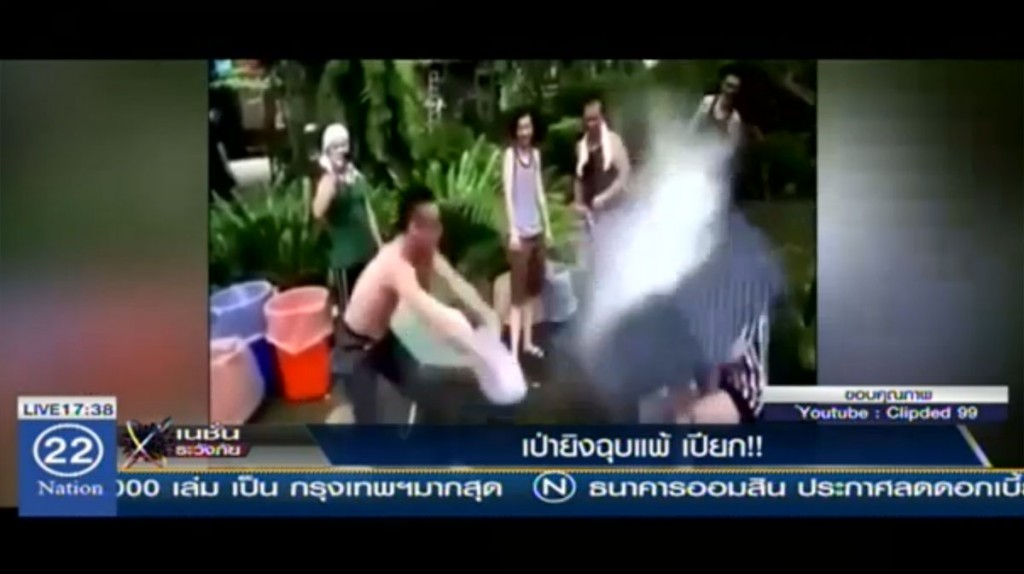 คลิปปิดท้ายวันนี้ ใกล้เทศกาลสงกรานต์แล้ว เรามีหนึ่งเกมมาแนะนำให้ท่านผู้ชมไปลองเล่นกัน ช่วงสงกรานต์ สิ่งที่ทุกคนนึกถึง ก็คือการเล่นสาดน้ำกันบนท้องถนน แต่คลิปนี้ครับไม่ได้เป็นแบบที่คิดไว้ เขาทำอะไรกัน มีกรรมการคอยยืนตัดสิน มีฝ่ายซ้าย มีฝ่ายขวา ร่มคนละ 1 คัน เพราะเกมส์นี้ถ้าคนไหนเป่ายิงชุบแพ้ แล้วคนแพ้หยิบร่มไม่ทัน คนนั้นจะต้องโดนน้ำในถังสาดอย่างแรง แต่สงสัยไหมครับว่า ทำไมต้องมีร่ม เอามากางปิดไว้ นั่นอาจเป็นเพราะว่า ถ้าไม่เอามาบังไว้ คนโดนสาด มีหวังอาจถึงขั้นหงายท้องได้เลยละครับ