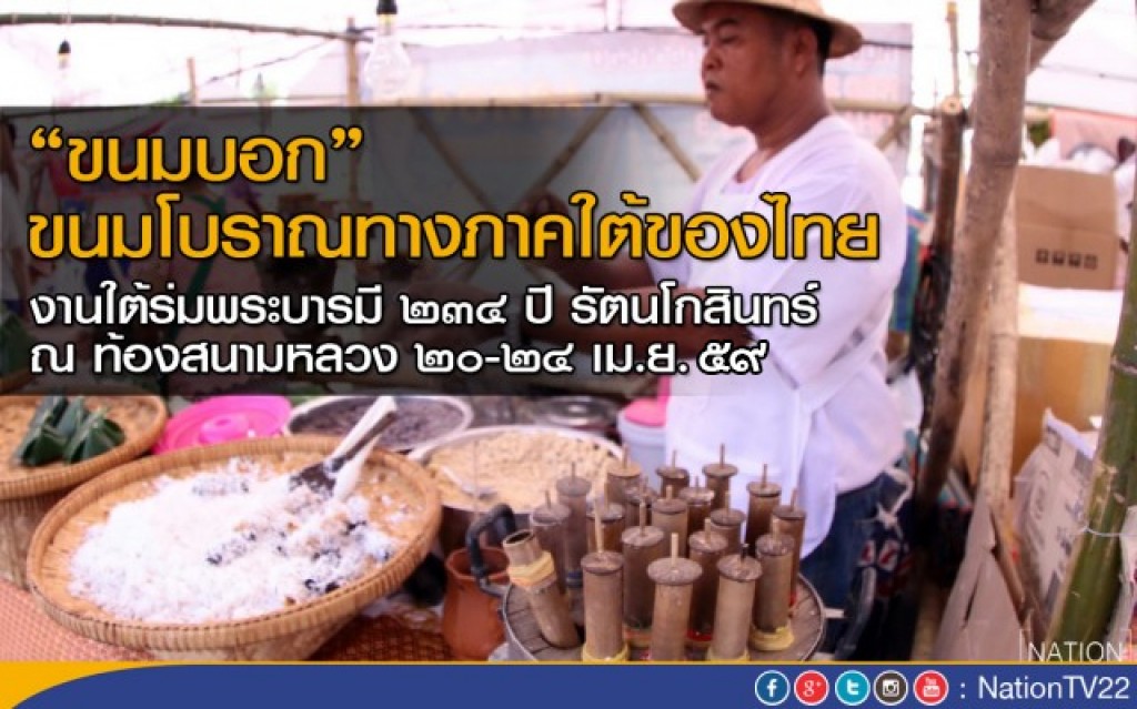 ขนมบอกโบราณ จ.สงขลา ซึ่งเป็นขนมโบราณทางภาคใต้ของไทย อุปกรณ์ที่ใช้ในการทำมีทั้งสแตนเลสและไม้ไผ่ ผู้ที่สนใจสามารถแวะมาชิมได้ที่ งานใต้ร่มพระบารมี ๒๓๔ปี รัตนโกสินทร์ ณ สนามหลวง