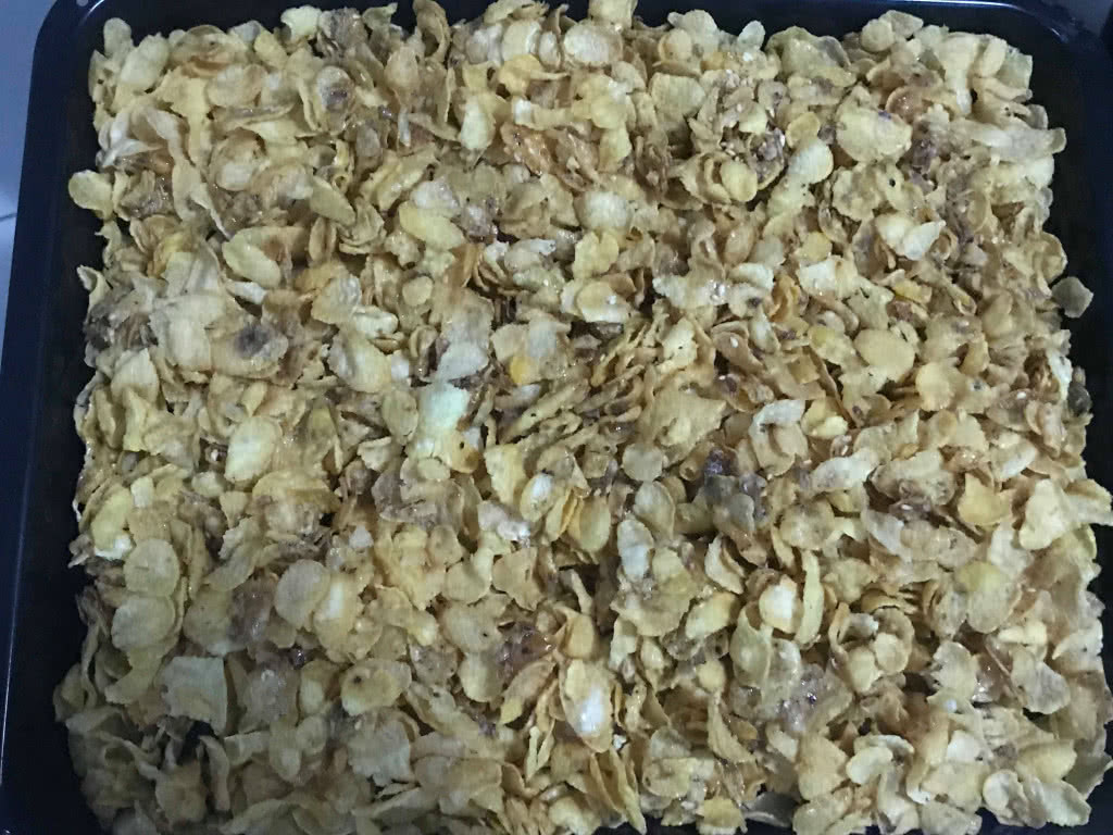 แต่ถ้าใครกระทะเล็ก แนะนำให้เทคอนเฟลคใส่ถาดใหญ่ๆ แล้วค่อยๆเทน้ำที่เราเคี่ยวไว้ลงค่อยๆคลุก โรยงา ผึ่งให้หายร้อน ใครมีเตาอบเข้าเตาอบลมไล่ความชื้น หรือไม่มีก็รอเย็นแล้วเก็บใส่กล่องปิดฝาให้สนิท เก็บไว้ทานได้หลายวัน ใครชอบเม็ดมะม่วงหิมพานต์ ลูกเกด หรือเมล็ดฟักทอง แตงโมอะไร ก็ใส่ได้ ตามความชอบ ตามของที่มีในบ้านได้