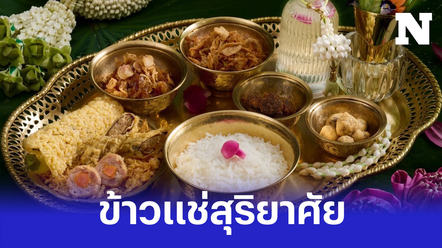 ข้าวแช่สุริยาศัย รังสรรค์ด้วยความประณีตและพิถีพิถันตามแบบฉบับชาววัง ไม่ว่าจะเป็นข้าวลอยน้ำดอกไม้ หรือเครื่องเคียงนานาชนิดอย่าง พริกหยวกสอดไส้ห่มแพไข่ ไชโป้วหวานผัดหวาน ลูกกะปิทอด ปลายี่สนผัดหวาน หมูฝอยหวานเค็ม หมูสับปลาเค็มทรงเครื่องสอดไส้ไข่แดงเค็ม และพริกแห้งบางช้างสอดไส้ปลากะพงทอด รับประทานเคียงด้วยผักแนมที่แกะสลักอย่างสวยงาม