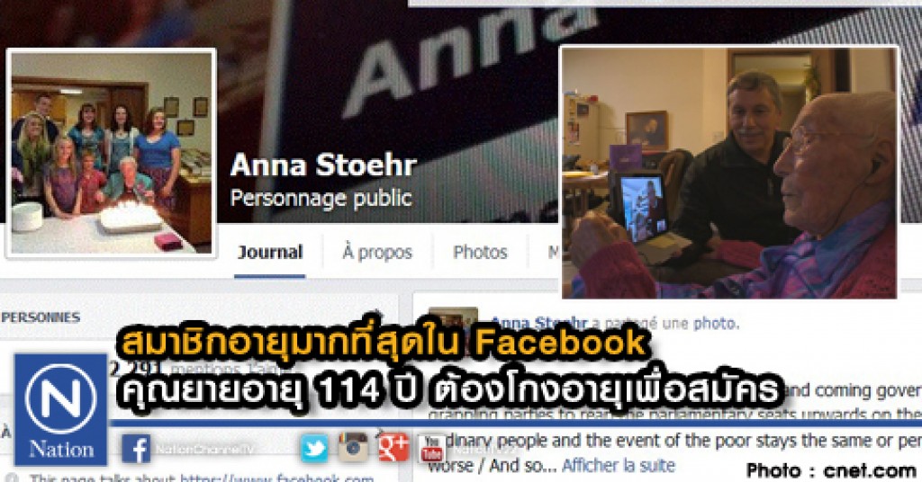 แอนนา สโตเออร์ (Anna Stoehr) ได้รับการบันทึกว่าเป็นเจ้าของFacebook ที่มีอายุมากที่สุด นั่นคือ 114 ปีAnna Stoehr พำนักอยู่ในเมืองเพลนวิว รัฐมินนิโซตา สหรัฐอเมริกา และเธอเพิ่งจะฉลองวันเกิดครบรอบ 114 ปี ไปเมื่อวันอาทิตย์ที่ 12 ตุลาคม ที่ผ่านมา และงานฉลองวันเกิดของเธอ..คือภาพประจำตัวของคุณยายบนเฟซบุ๊ค