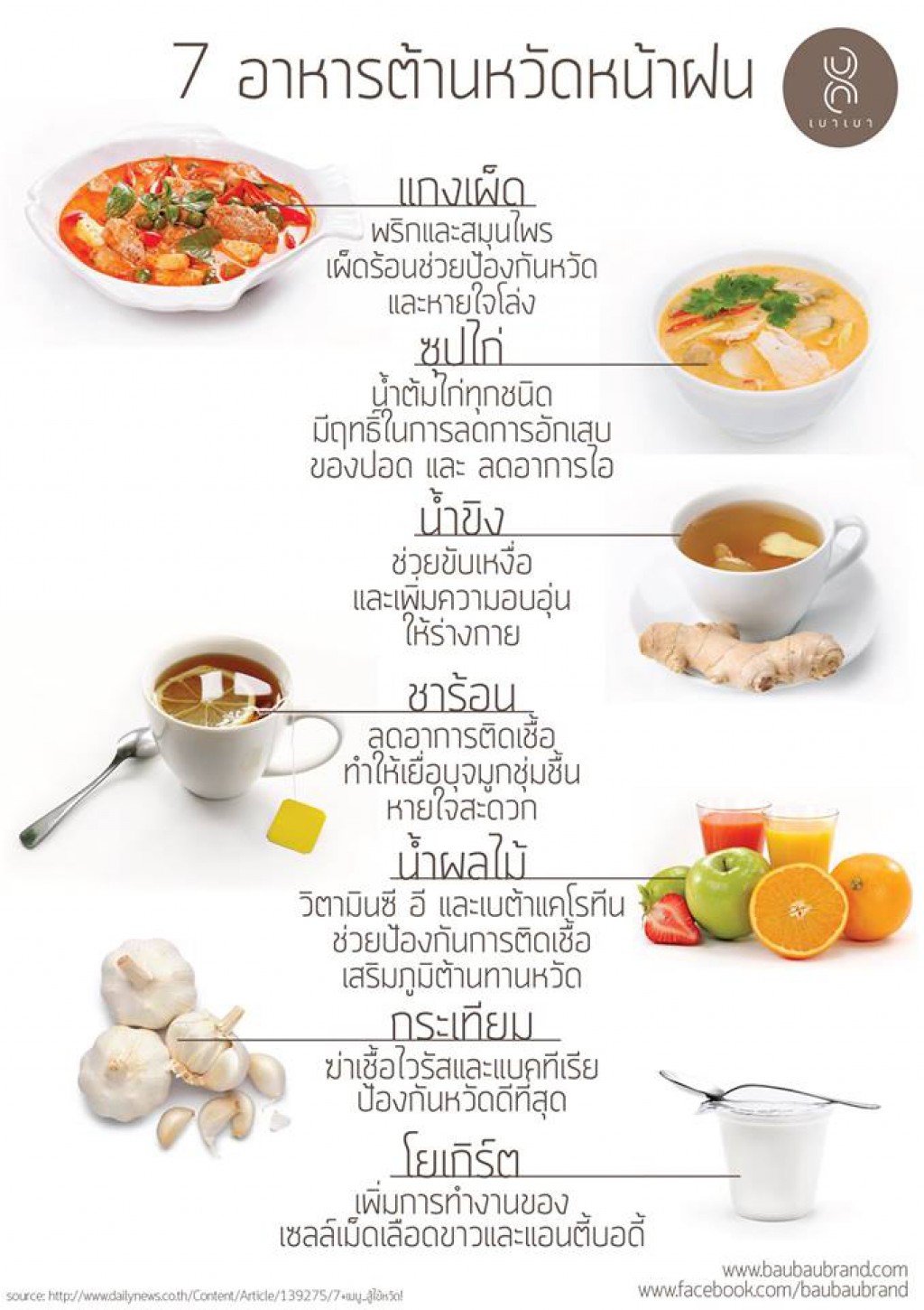 2 ซุปไก่ น้ำต้มไก่ แกงข่าไก่น้ำที่ต้มไก่มีสรรพคุณในการต้านหวัดที่ทั่วโลกรู้กัน โดยมีรายงานวิจัยพบว่าซุปไก่มีฤทธิ์ยับยั้งการเคลื่อนที่ของเม็ดเลือดขาวชนิดที่เรียกว่า นิวโทรฟิลด์ ไปยังเนื้อเยื่อปอด ทำให้ลดกระบวนการอักเสบในปอด และลดอาการไอ