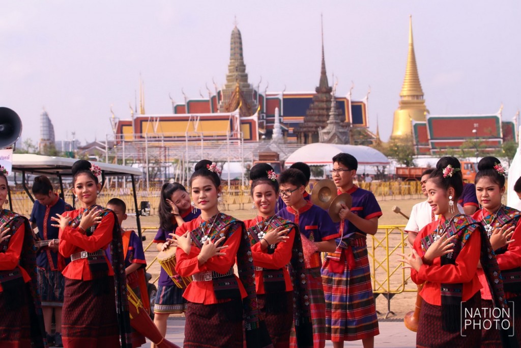 ขบวนนางรำในพิธีเปิดงานปล่อยขบวนรถ ไหว้พระ ๙ วัด สืบสิริสวัสดิ์ ๙ รัชกาล ที่จัดโดยกรมการศาสนา กระทรวงวัฒนธรรม ภายในงานใต้ร่มพระบารมี ๒๓๔ปี รัตนโกสินทร์ ณ สนามหลวง