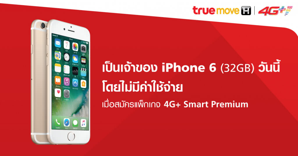 ล่าสุด! ทรูมูฟ เอช ออกโปรโมชั่นแรงยิ่งกว่า ให้สาวกหรือผู้ชื่นชอบ iPhone มีโอกาสได้เป็นเจ้าของ iPhone 6 (32 GB) โดยไม่มีค่าใช้จ่าย มาพร้อมแพ็กเกจ 4G+ Smart Premium คุ้มค่ากว่าเดิมถึง 2 เท่า ด้วยค่าโทรเยอะสุดคุ้มถึง 8,000 นาที เล่นเน็ต 4G/3G และ Wifi ไม่จำกัด แถมผ่อนสบายๆ กับบัตรเครดิตที่ร่วมรายการนานถึง 10 เดือน
