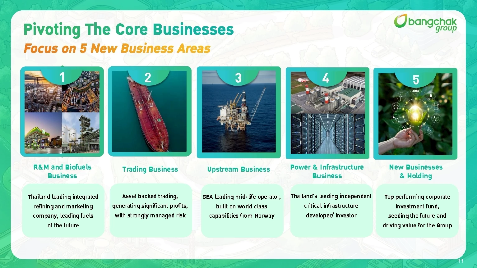 แต่ปัจจุบัน เรากำลังเผชิญกับความท้าทายที่ซับซ้อน ท่ามกลางความผันผวนของภูมิรัฐศาสตร์ ราคาพลังงานที่ไม่แน่นอน และแรงกดดันจากการเปลี่ยนผ่านด้านสภาพภูมิอากาศ แม้สังคมโลกจะเร่งผลักดันการลดคาร์บอน แต่รายงานจากหลายสำนักยังชี้ว่าไฮโดรคาร์บอนจะคงเป็นพลังงานหลักของเศรษฐกิจโลกจนถึงปี 2593 ดังนั้น บางจากฯ เร่งเครื่องกลยุทธ์ Bangchak 100x เพื่อการเติบโตอย่างมั่นคง โดยมุ่งเน้นการลงทุนที่สร้างผลตอบแทน (Return-Focused Investment) ควบคู่กับการขยายการดำเนินงานในระดับสากล ให้ความสำคัญกับการสร้างคุณค่าในธุรกิจหลักและการใช้เงินลงทุนอย่างมีประสิทธิภาพ เพื่อรักษาความเป็นผู้นำด้านอัตราผลตอบแทนผู้ถือหุ้น (Top Tier TSR) ซึ่งตลอด 5 ปีที่ผ่านมาอยู่ในระดับสูงกว่าคู่แข่ง และพร้อมผลักดันให้ดียิ่งขึ้น ขณะเดียวกันยังมุ่งสู่การเปลี่ยนผ่านด้านพลังงาน ด้วยการลงทุนเพื่อรองรับอนาคตที่ขับเคลื่อนด้วยเชื้อเพลิงโมเลกุลสะอาด (Clean Molecules – Future Proof) พลังงานทางเลือกที่ช่วยลดการปล่อยคาร์บอนสู่บรรยากาศ และตอบโจทย์ความยั่งยืนในระยะยาว