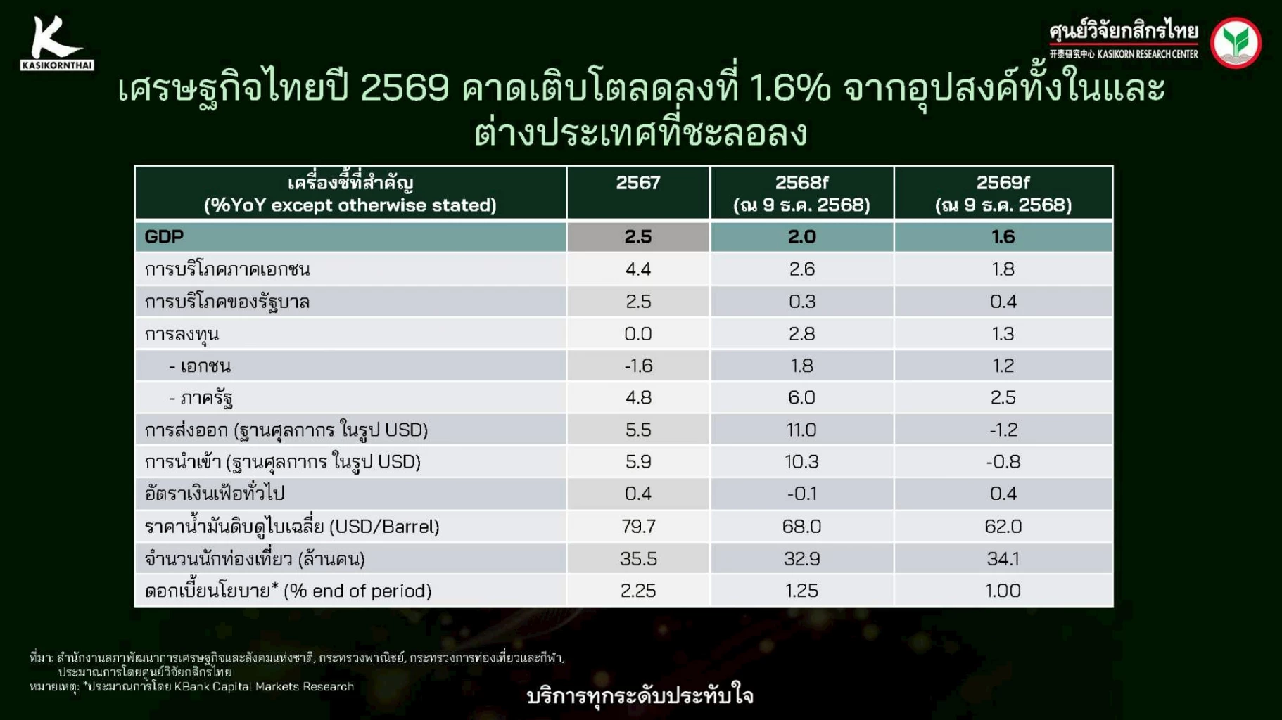 นายบุรินทร์ อดุลวัฒนะ กรรมการผู้จัดการ และ Chief Economist บริษัท ศูนย์วิจัยกสิกรไทย จำกัด เปิดเผยว่า ในปี 2569 องค์การการค้าโลก (WTO) คาดการณ์ว่าการค้าโลกมีแนวโน้มชะลอตัวลงจากปี 2568 ที่ขยายตัวได้ 2.4% มาอยู่ที่ 0.5% เนื่องจากมาตรการภาษีของทรัมป์ได้ส่งผลต่อต้นทุนการค้าและเพิ่มความไม่แน่นอน ในปี 2568 การค้าโลกได้อานิสงส์จากการเร่งส่งออกของภาคธุรกิจก่อนที่ภาษีเริ่มบังคับใช้จริงในเดือนสิงหาคม บวกกับแรงหนุนจากการส่งออกสินค้าเกี่ยวกับเทคโนโลยี AI ที่พุ่งแรง โดยเฉพาะการส่งออกจากเอเชียไปสหรัฐฯ ตามการลงทุนใน Data Center และโครงสร้างพื้นฐาน AI ของสหรัฐฯ สวนทางกับสินค้าประเภทอื่นที่ไม่ใช่ AI (Non-AI) ที่ชะลอตัวลงอย่างชัดเจน ในขณะที่การส่งออกจากจีนไปเอเชียยังเติบโตได้ดีต่างกับการส่งออกไปสหรัฐฯ อย่างไรก็ดีธุรกิจในประเทศจีนยังเผชิญกับการแข่งขันรุนแรงทั้งด้านกำลังการผลิตและสงครามราคา (Anti-Involution) ซึ่งกดดันการทำกำไรของภาคธุรกิจในจีนอย่างต่อเนื่อง