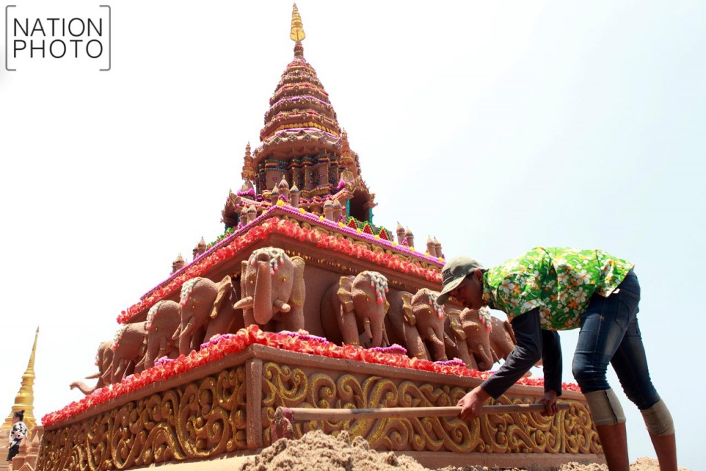 ประชาชนกำลังก่อเจดีย์ทรายในงานประเพณีก่อพระทรายวันไหลบางแสน จัดในช่วงวันที่ 16-17 เมษายน ของทุกปี เพื่ออนุรักษ์และส่งเสริมวัฒนธรรมประเพณี ซึ่งเป็นวันแรกของการจัดกิจกรรมวันไหลบางแสน ณ หาดบางแสน จังหวัดชลบุรี เมื่อวันที่ 16 เมษายน 2559