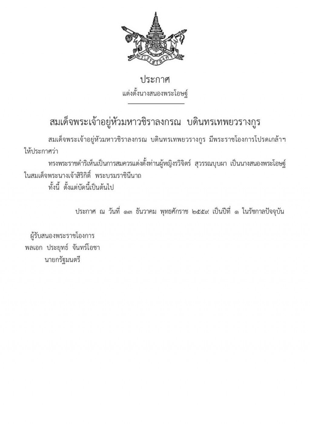 ประกาศ ณ วันที่ 13 ธันวาคม พุทธศักราช 2559 เป็นปีที่ 1 ในรัชกาลปัจจุบัน