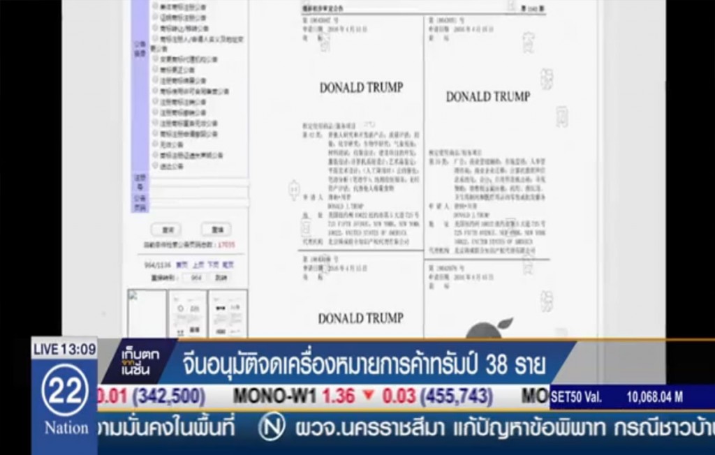 ทรัมป์ ออกาไนเซชัน ยื่นขอจดทะเบียนเครื่องหมายการค้าในจีนตั้งแต่เม.ย.2559 ช่วงที่ทรัมป์ยังคงหาเสียงเลือกตั้ง แต่การอนุมัติการจดทะเบียนล่าสุดอาจสร้างปัญหาให้กับทรัมป์ที่ขณะนี้เปลี่ยนสถานะจากนักธุรกิจเป็นประธานาธิบดีแล้ว และอาจเผชิญเสียงวิจารณ์เรื่องผลประโยชน์ทับซ้อน