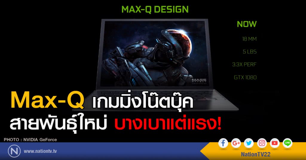 Max-Q เป็นแนวทางโน๊ตบุ๊คเกมมิ่งที่ NVIDIA ระบุว่ามีน้ำหนักน้อยกว่าเกมมิ่งโน๊ตบุ๊คก่อน ๆ ถึง 3 เท่า เทียบเท่ากับ MacBook Air หรือก็คือ Max-Q จะน้ำหนักไม่เกิน 2 กิโลกรัม และ Max-Q จะมีประสิทธิภาพการทำงานมากกว่าเกมมิ่งโน๊ตบุ๊ครุ่นก่อน ๆ ถึง 3 เท่า ให้ประสิทธิภาพการเล่นเกมสูงกว่าเกมมิ่งโน๊ตบุ๊คในปัจจุบันถึง 70%