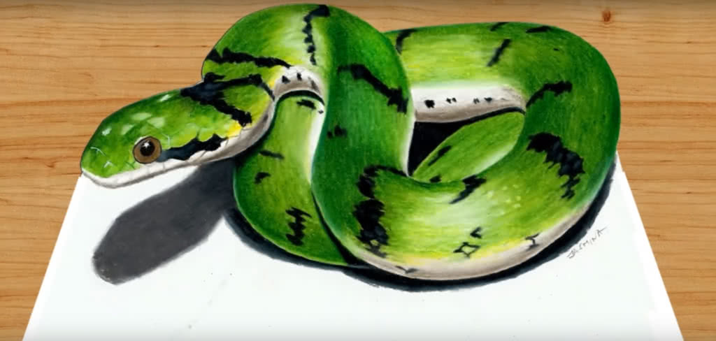 คลิปการวาดภาพ 3D Colored Pencil Drawing : Cute Green Snake - Speed Draw ภาพวาด 3 มิติ ซึ่งเป็นภาพวาดงูที่เหมือนจริงมาก
