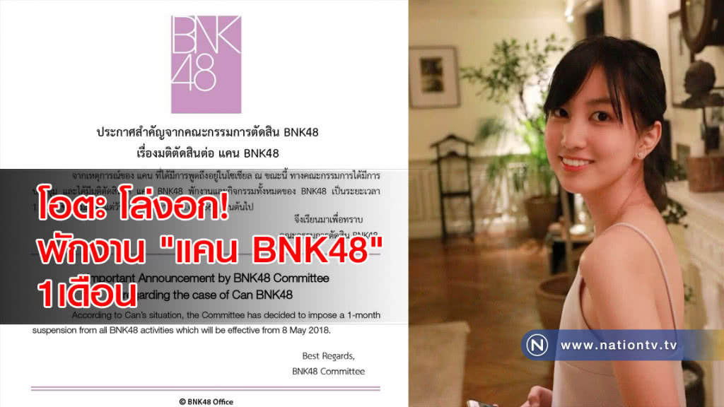 ล่าสุดทางต้นสังกัด BNK48 ออกมาประกาศบทลงโทญต่อ "แคนแคน BNK48" ว่า "ประกาศสำคัญจากคณะกรรมการตัดสิน BNK48 เรื่องมติตัดสินต่อ แคน BNK48 จากเหตุการณ์ของแคน ที่ได้มีการพูดถึงในโซเชียล ณ ขณะนี้ ทางคณะกรรมการได้มีการประชุม และได้มีมติตัดสินให้ แคน BNK48 พักงานและกิจกรรมทั้งหมดของ BNK48 เป็นระยะเวลา 1 เดือน ซึ่งจะมีผลตั้งแต่วันที่ 8 พฤษภาคม พ.ศ.2561 เป็นต้นไป"
