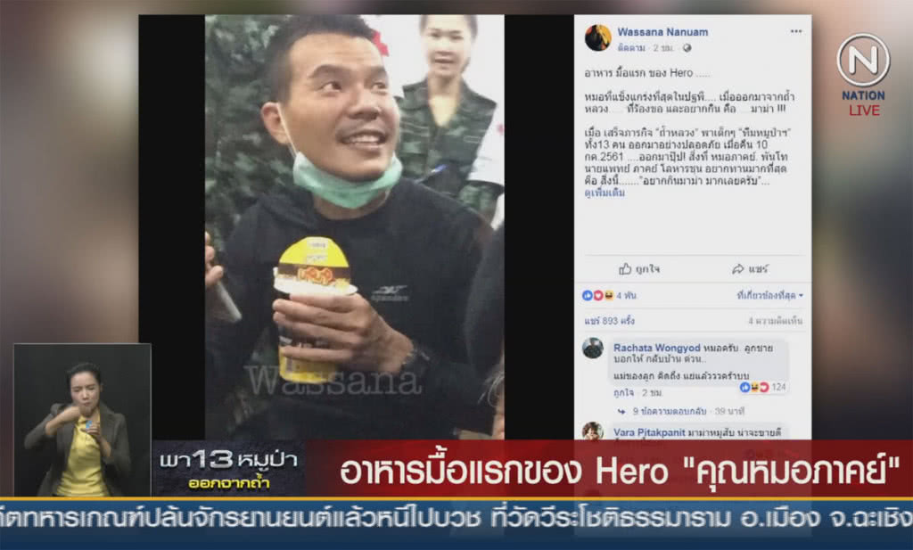 หลังจากเสร็จสิ้นภารกิจช่วยน้องๆและโค้ชทีมหมูป่าทั้ง 13 ชีวิต เฟซบุ๊กของนักข่าวสายทหาร วาสนา นาน่วม เปิดเผยภาพอาหารมื้อแรกของหมอภาคย์ คือ บะหมี่กึ่งสำเร็จรูป