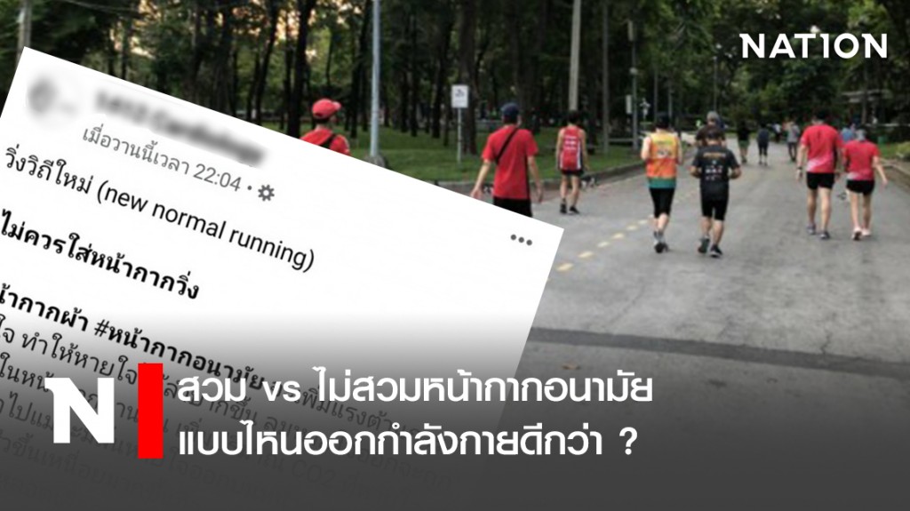 เพจเฟซบุ๊ก 1412 Cardiology ซึ่งเป็นเพจให้ความรู้ด้านการแพทย์ เขียนเรื่องราวได้น่าสนใจ ประเด็น วิ่งวิถีใหม่ (new normal running) ได้ให้ข้อมูลว่าไม่ควรใส่หน้ากากอนามัย หรือหน้ากากผ้า ในการวิ่ง เพราะจะเพิ่มแรงต้านการหายใจ ทำให้หายใจได้ลำบากขึ้น ลมหายใจออกจะถูกกักอยู่ในหน้ากากนานขึ้น เพิ่มปริมาณ CO2 ที่หายใจกลับเข้าไปแม้จะมีลิ้นหายใจออกบนหน้ากากก็ตาม ยิ่งหายใจเร็วขึ้นเหนื่อยมากขึ้นก็จะแย่ลง นอกจากปอด หัวใจและหลอดเลือดจะต้องทำงานหนักมากขึ้น HR จะเข้าโซนเร็วกว่าปกติ ใน well-trained athletes จะทนทานได้ในระดับหนึ่ง แต่นักวิ่งหน้าใหม่ กลุ่มผู้สูงอายุ หรือผู้ป่วย เป็นอันตรายได้ ความร้อนที่เกิดขึ้นในหน้ากากสูงทำให้เกิดเหงื่อ หน้ากากจะเปียกได้ง่ายจากด้านใน การป้องกันอาจจะไม่ดีเท่าในขณะที่หน้ากากแห้ง
