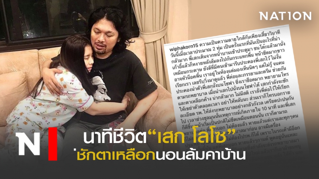 "ความเป็นความตายใกล้กันเพียงเสี้ยววินาทีวันนี้เมื่อเวลาประมาณ 2 ทุ่ม เป็นครั้งแรกที่มันเป็นอะไรที่น่ากลัวมากพี่เสกเดินจากหน้าบ้านเข้าประตูมาชนโต๊ะแล้วมานั่งเก้าอี้แล้วก็หงายหลังล้มลงไปก้นกระแทกพื้นหน้าซีดมากขาวเหมือนกระดาษ ยังดีที่มีคนเข้ามารีบประคองพี่เสกไว้ไม่งั้นอาจหัวน็อกพื้น"