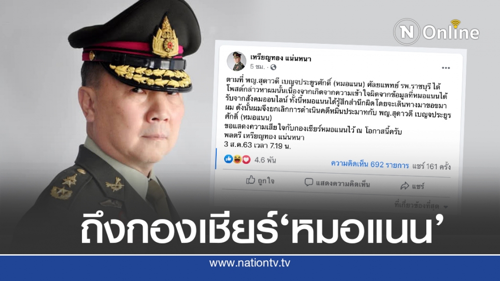 และล่าสุดเหมือนกับว่าประเด็นนี้ได้ชัดเจนแล้ว เมื่อหมอเหรียญทอง โพสต์ชี้แจงว่า ทางพญ. คนดังจะเดินทางมาขอขมาด้วยตัวเอง ผ่านทางเฟซบุ๊กว่า "ตามที่ พญ.สุดาวดี เบญจประยูรศักดิ์ (หมอแนน) ศัลยแพทย์ รพ.ราชบุรี ได้โพสต์กล่าวหาผมนั้นเนื่องจากเกิดจากความเข้าใจผิดจากข้อมูลที่หมอแนนได้รับจากสังคมออนไลน์ ทั้งนี้หมอแนนได้รู้สึกสำนึกผิดโดยจะเดินทางมาขอขมาผม ดังนั้นผมจึงยกเลิกการดำเนินคดีหมิ่นประมาทกับ พญ.สุดาวดี เบญจประยูรศักดิ์ (หมอแนน)